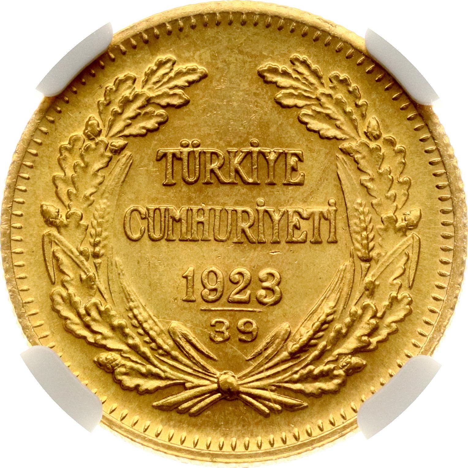 Turkey. 100 Kurus 1923//39. Gold .917, 7.21 g. KM 855. NGC MS 63