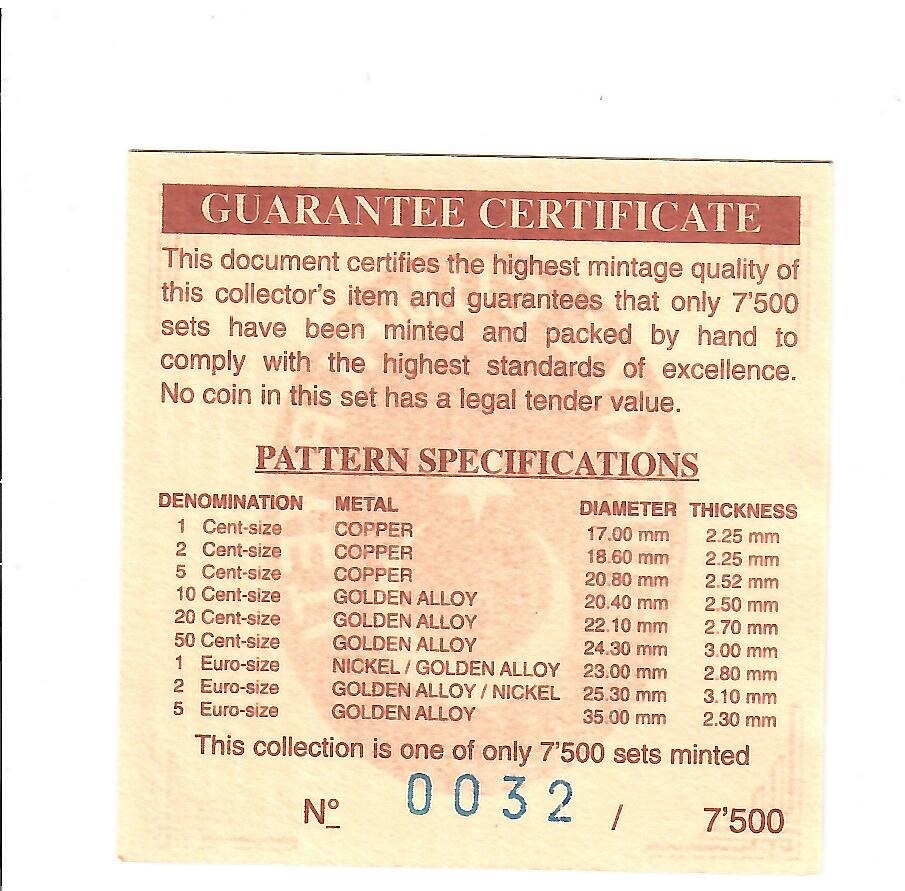 Box and Certificate. 1, 2, 5, 10, 20, 50 Euro Cents, 1, 2 Euros. KM X Pn 1-8.