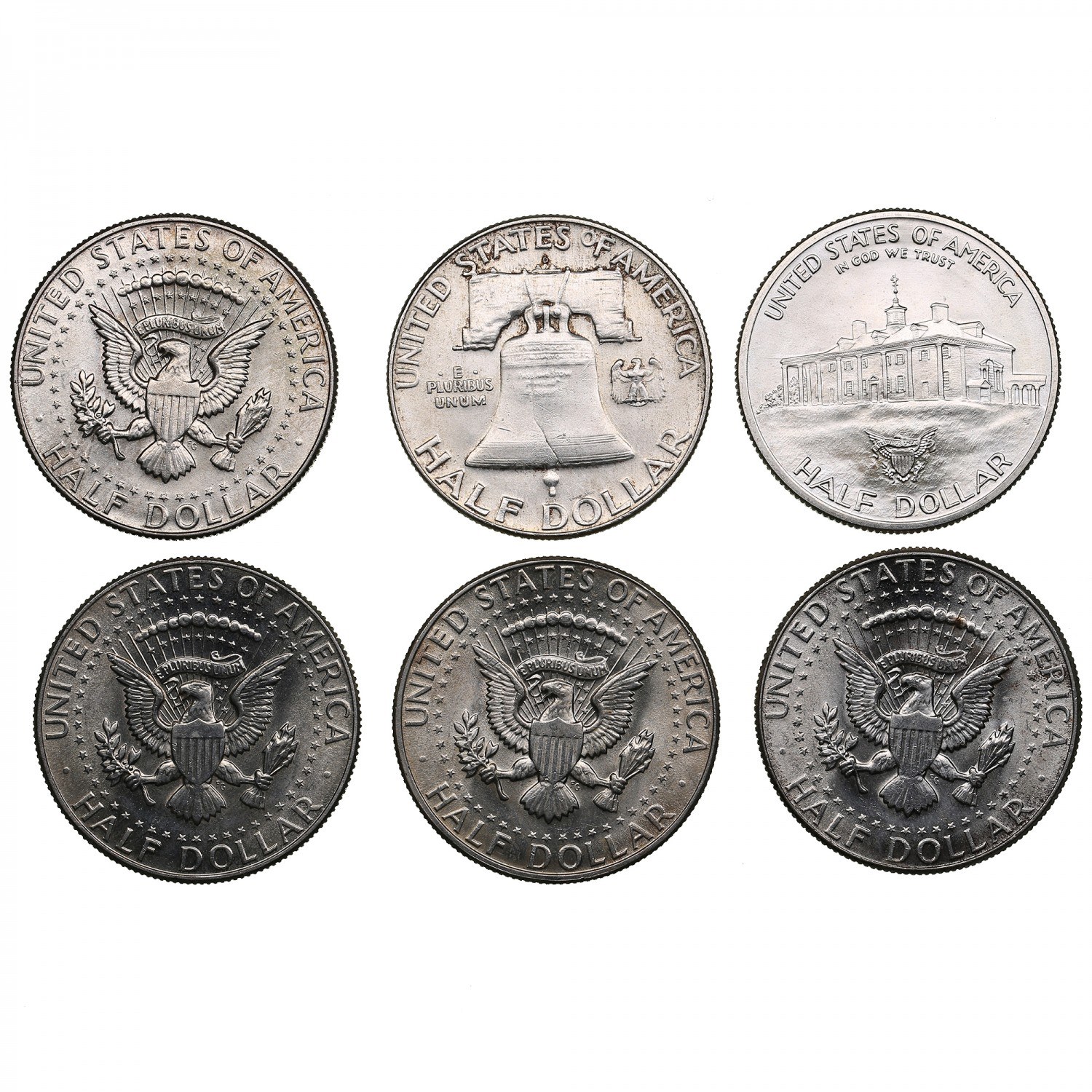 Various condition. ‘Franklin Half Dollar’ type. KM 199. ‘Kennedy Half Dollar’ type. KM 202a. 250th anniversary of George Washington's birth. KM 208.