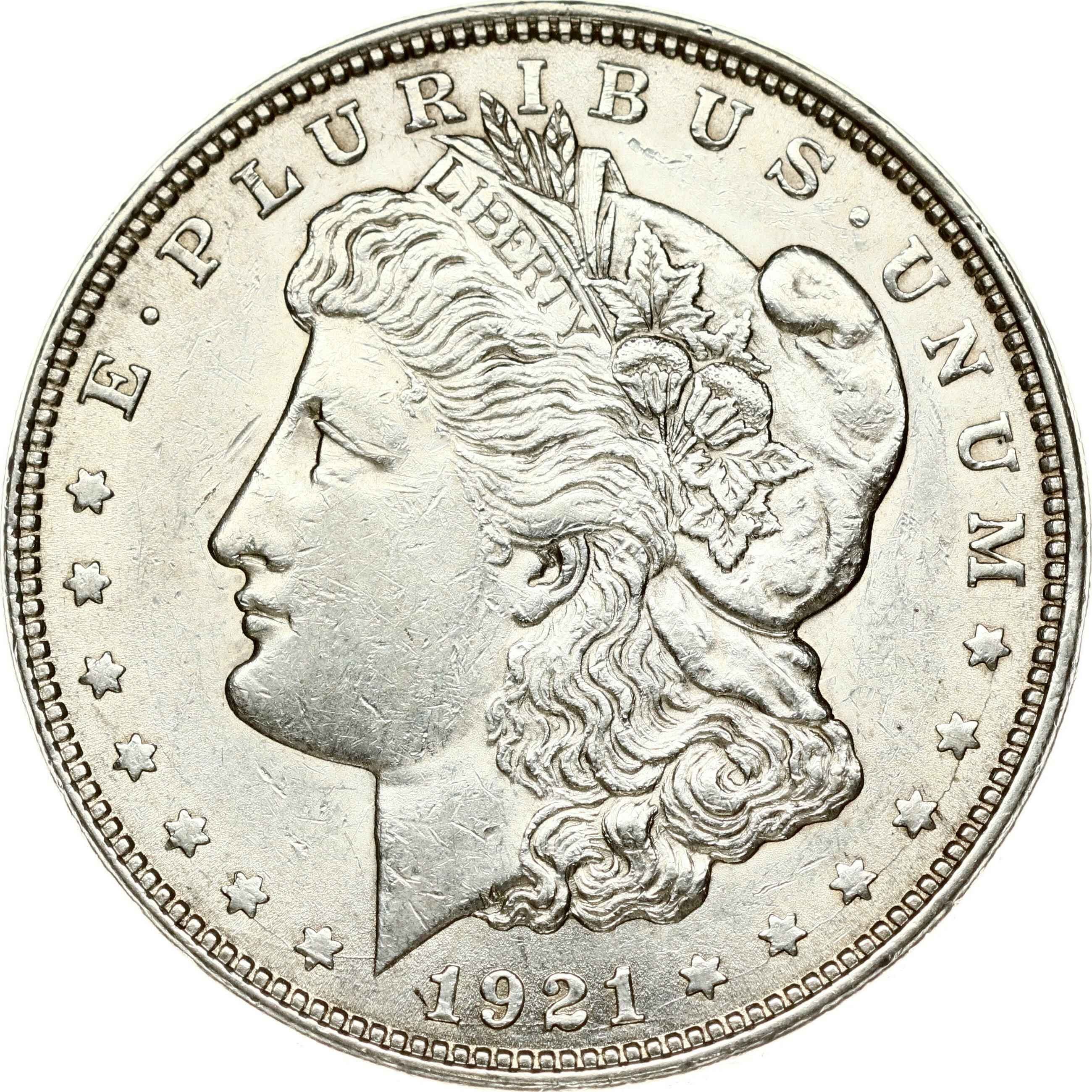 USA 1 Dollar 1921 'Morgan Dollar' Philadelphia. Obverse: Liberty head; facing left. Lettering: E�PLURIBUS�UNUM LIBERTY. Reverse: Eagle holding arrows and an olive branch; within wreath. Lettering: UNITED STATES OF AMERICA In God we trust * ONE DOLLAR *. Edge Reeded. Silver. Small Scratches. KM 110