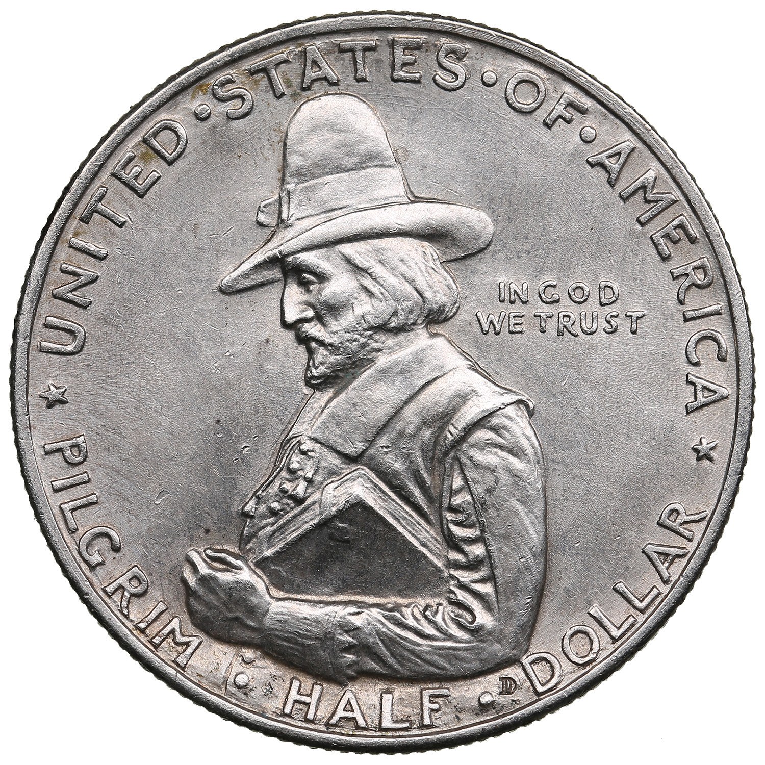 An attractive specimen, enhanced by mint luster. Commemorative coin: 300th anniversary of the pilgrims landing at Plymouth, Massachusetts. Engraver’s initial D - Cyrus E. Dallin.