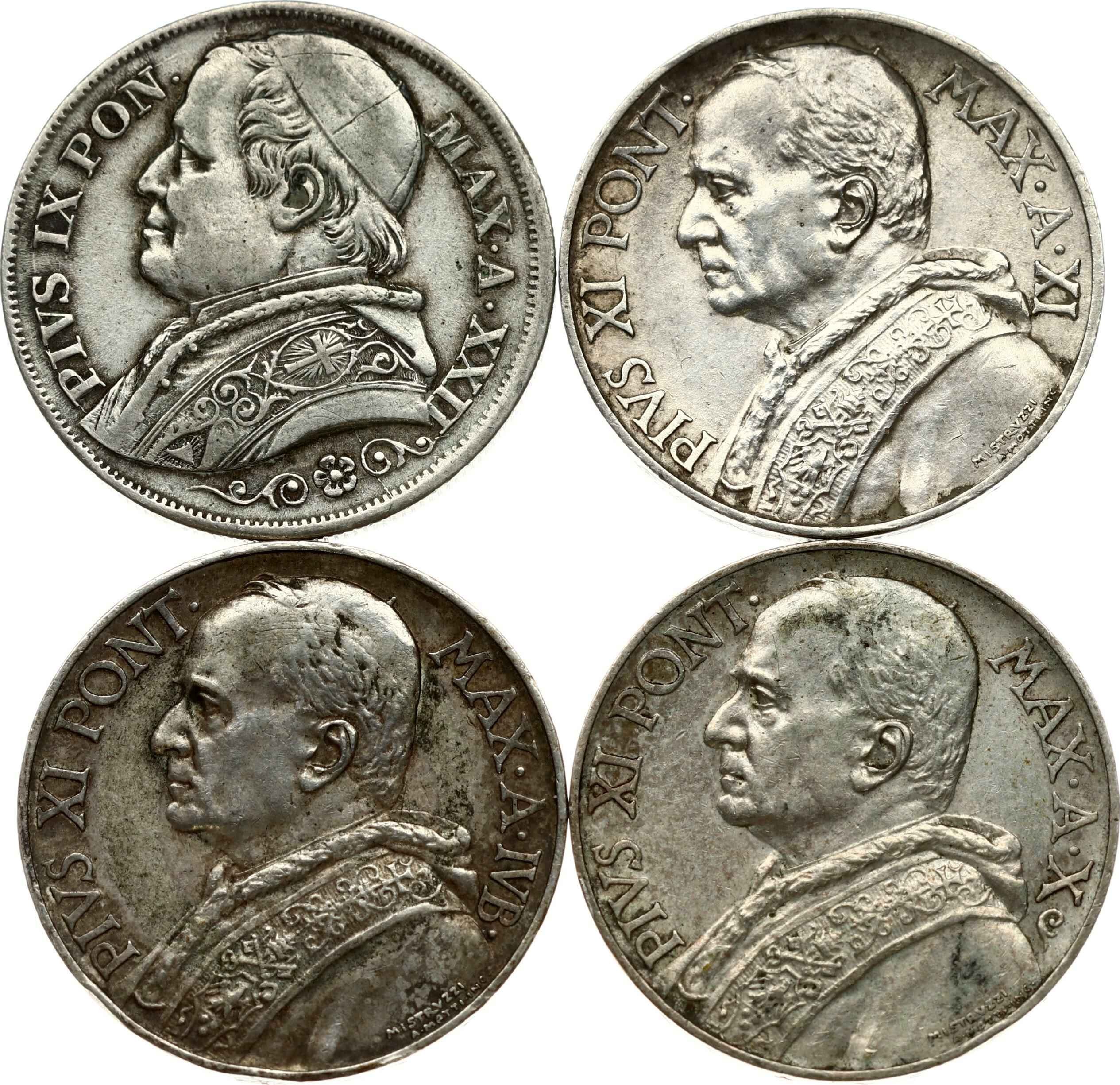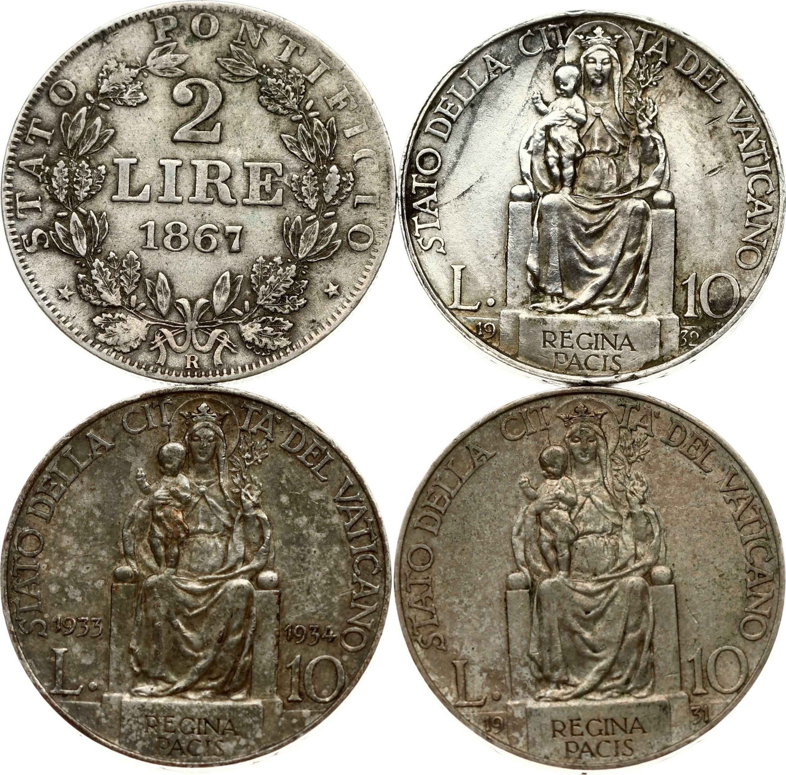 Italy, Vatican. 2 & 10 Lire 1867-1934. Silver total weight 39.96 g. KM 1379; 8. Lot of 4 coins.