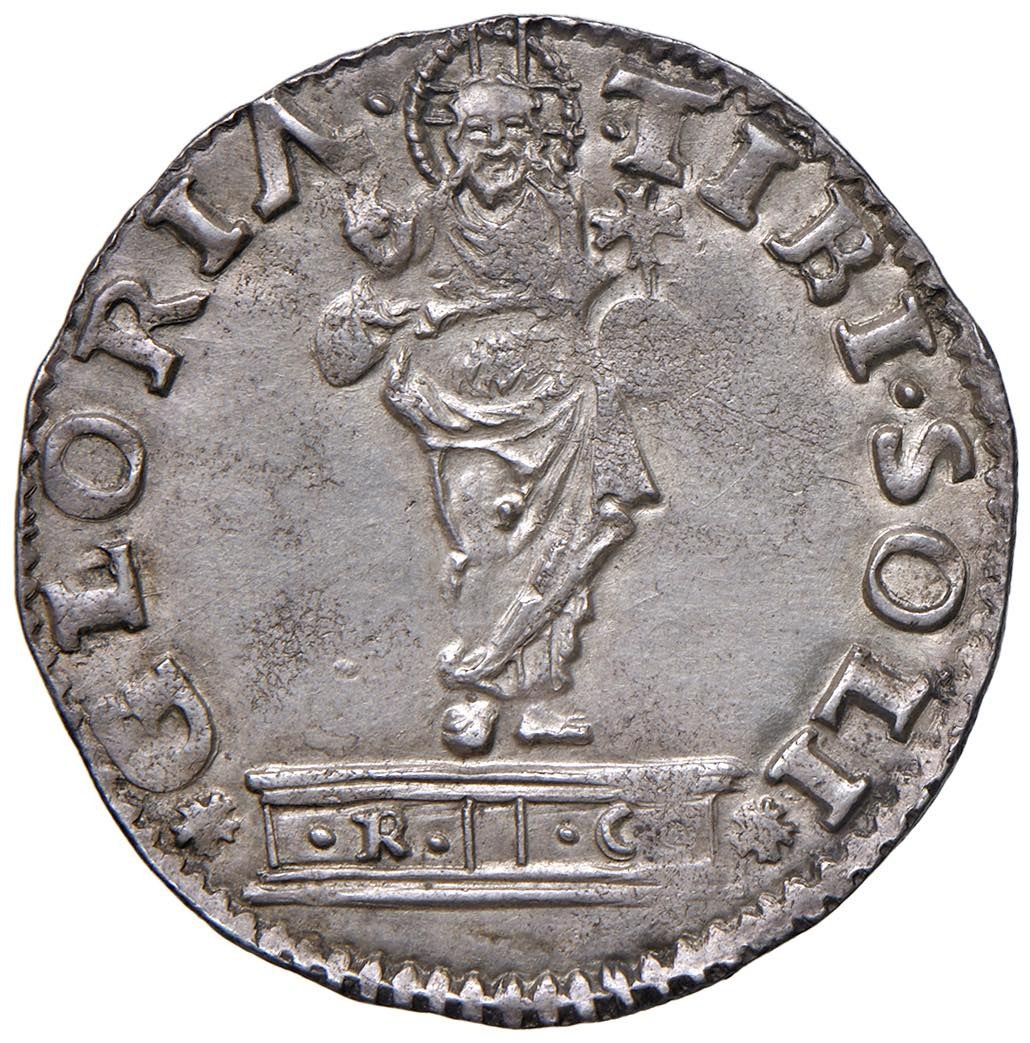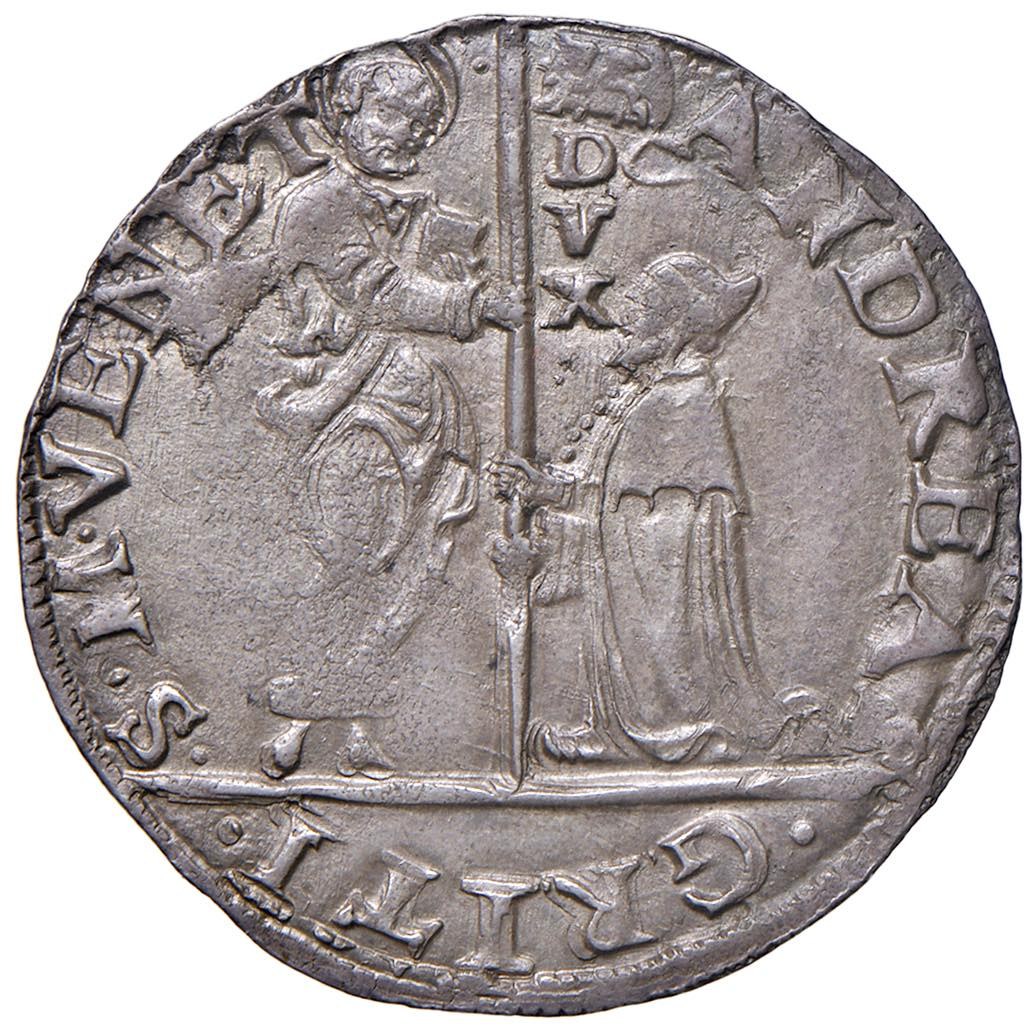 Venezia - Andrea Gritti (1523-1538) Mocenigo o Lira - D/ ANDREAS - GRITI - S M VENET, San Marco nimbato, stante a sinistra porge il vessillo al doge genuflesso; lungo l’asta, DVX R/ TIBI SOLI - GLORIA, il Redentore in piedi benedicente, con la sinistra tiene il globo crucifero, sul piedistallo sigla del massaro R C (Ruzier Contarini) - Mont. 347 Pao. 5 Ag 6,55 g • Esubero di materiale al dritto.