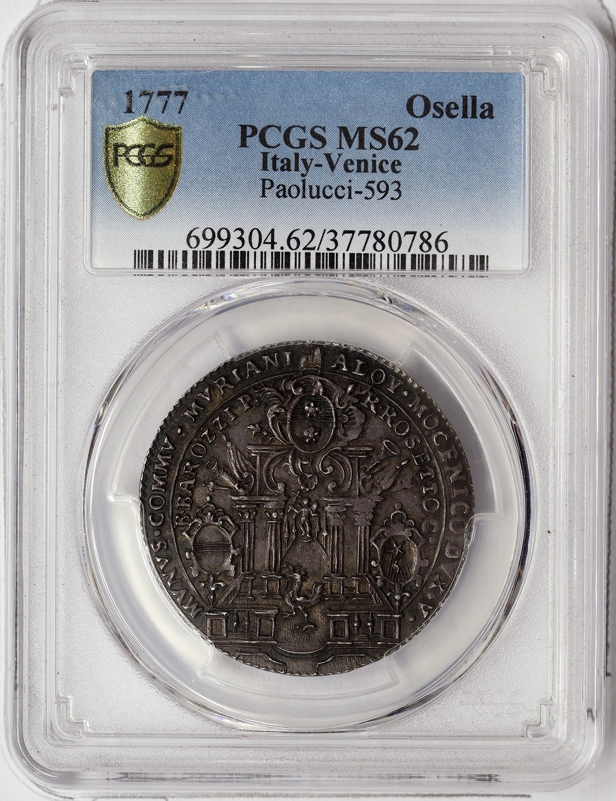 The mintage for this time period is of only 109 pieces following the studies of Zanetti in his " Delle Medaglie di Murano denominate Oselle " page 13 Ag. TOP POP. Very Rare.