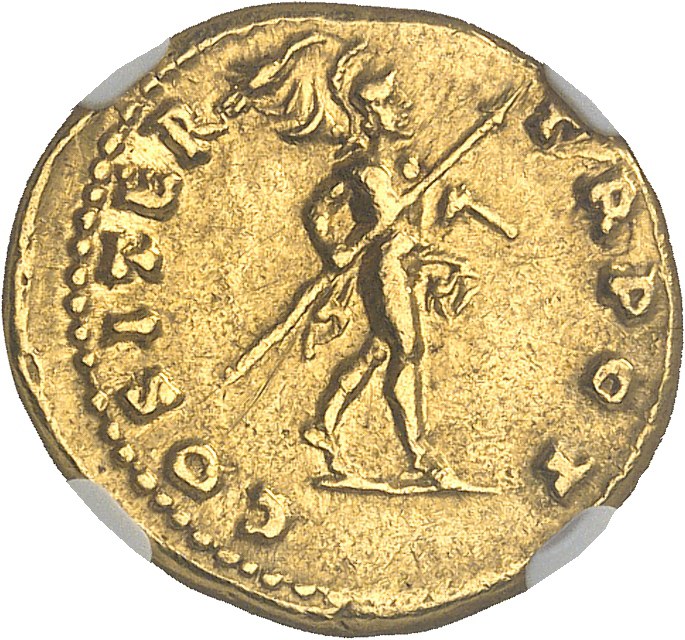 Rv. COS ITER TR POT. Mars avançant à droite, tenant une aigle légionnaire sur l’épaule gauche et une lance de la main droite.