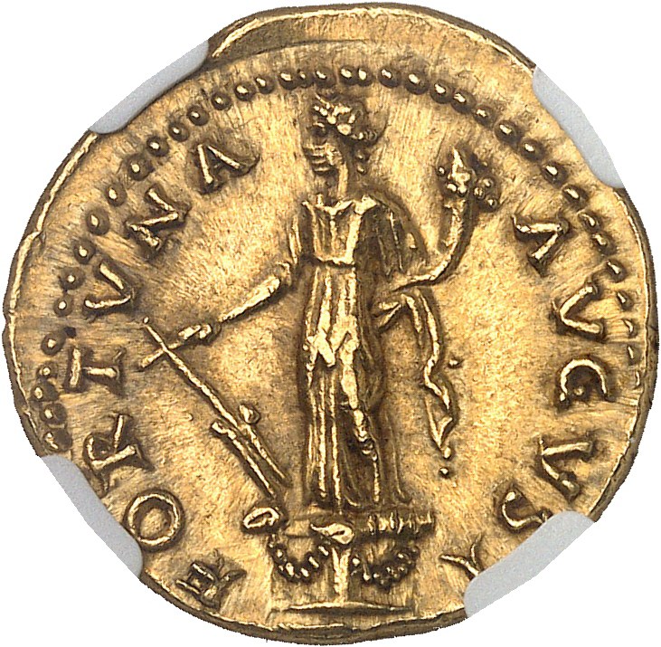 Rv. FORTVNA - AVGVST. La Fortune de bout à gauche, montée sur un autel, tenant une corne d’abondance et un gouvernail.