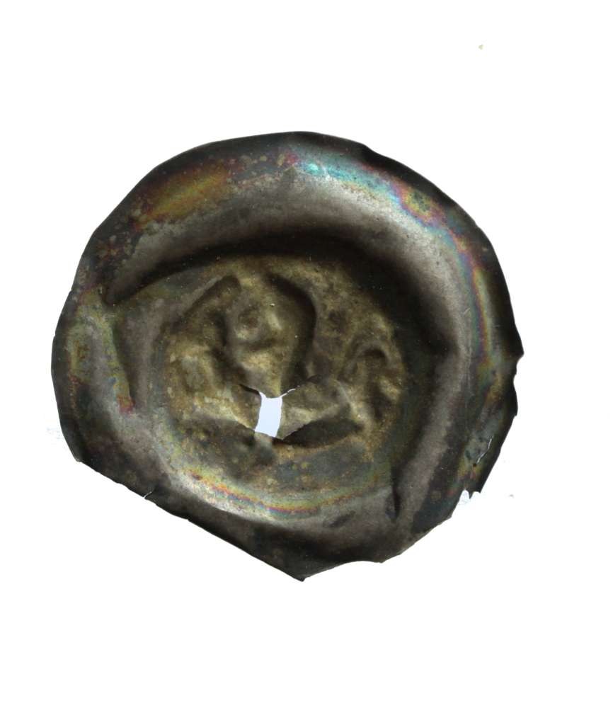 AR 24 morawski brakteat szeroki Wacława II (1278-1305), również polskiego króla-motyw kroczącego w lewo ukoronowanego lwa lub smoka;podobny motyw na brakteatach Przemysla II; stan III, ze złocistą patyną, fragmentarycznie zniekształcone obrzeże utrudniające rozpoznanie; CACH 1002 (?), bardzo rzadki
