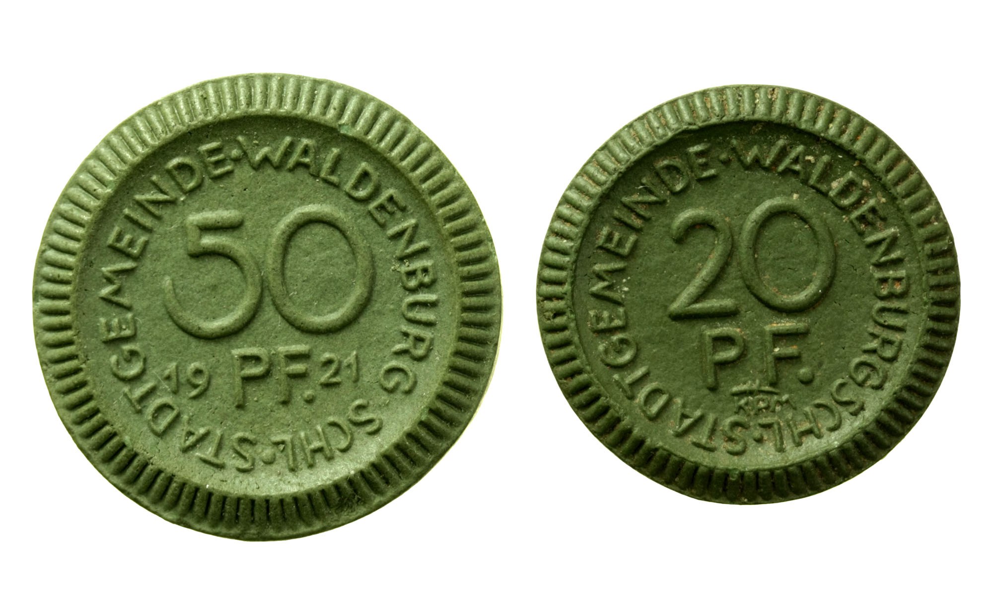 Wałbrzych / Waldenburg, zestaw 20 i 50 fenigów 1921. Razem 2 szt. Ceramika. Stan zachowania 2. Dobrze zachowane egzemplarze.