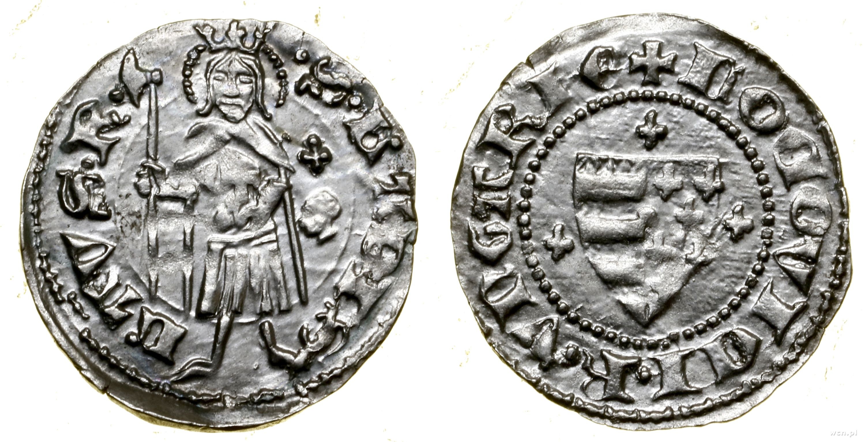 Aw: Tarcza andegaweńska, wokół trzy lilie, + • LODOVICI • R • VNGARIE, Rw: Św. Władysław stojący na wprost, trzymający halabardę i jabłko królewskie, po prawej znak menniczy w formie głowy w lewo i lilia powyżej, S LADIS LAVS R