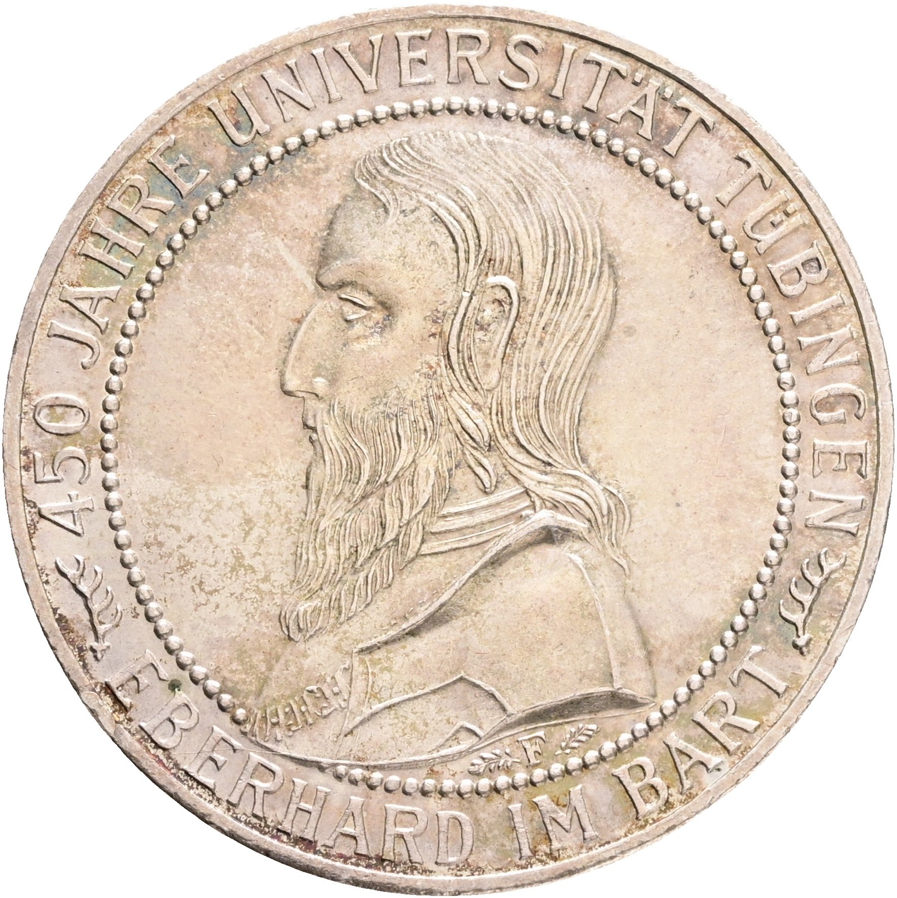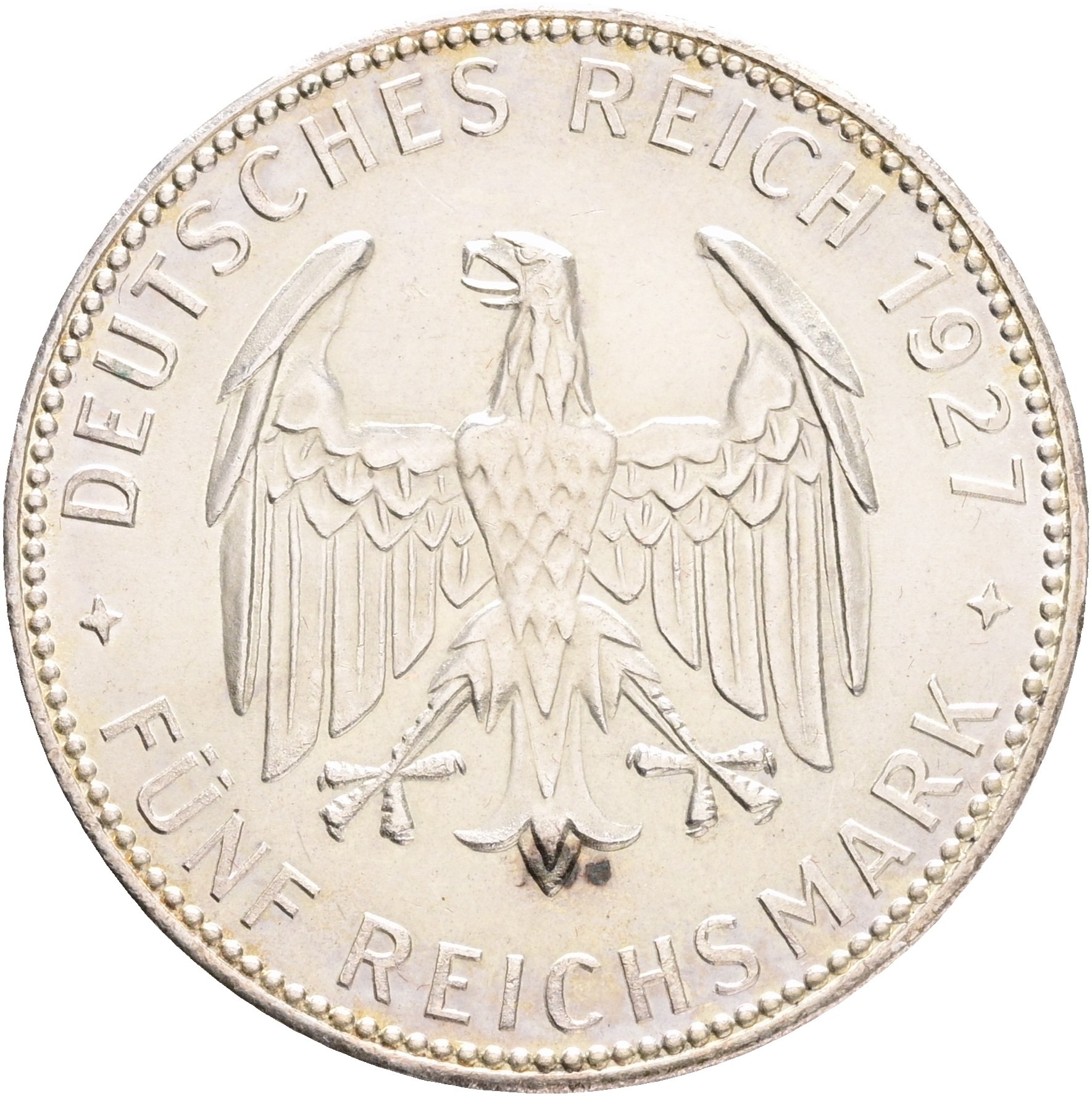Weimar republic 5 Mark 1927 F 450th Anniversary of the Tubingen University, J#329, Ag.500 25g , 36mm, Stuttgart, place with lustr mint