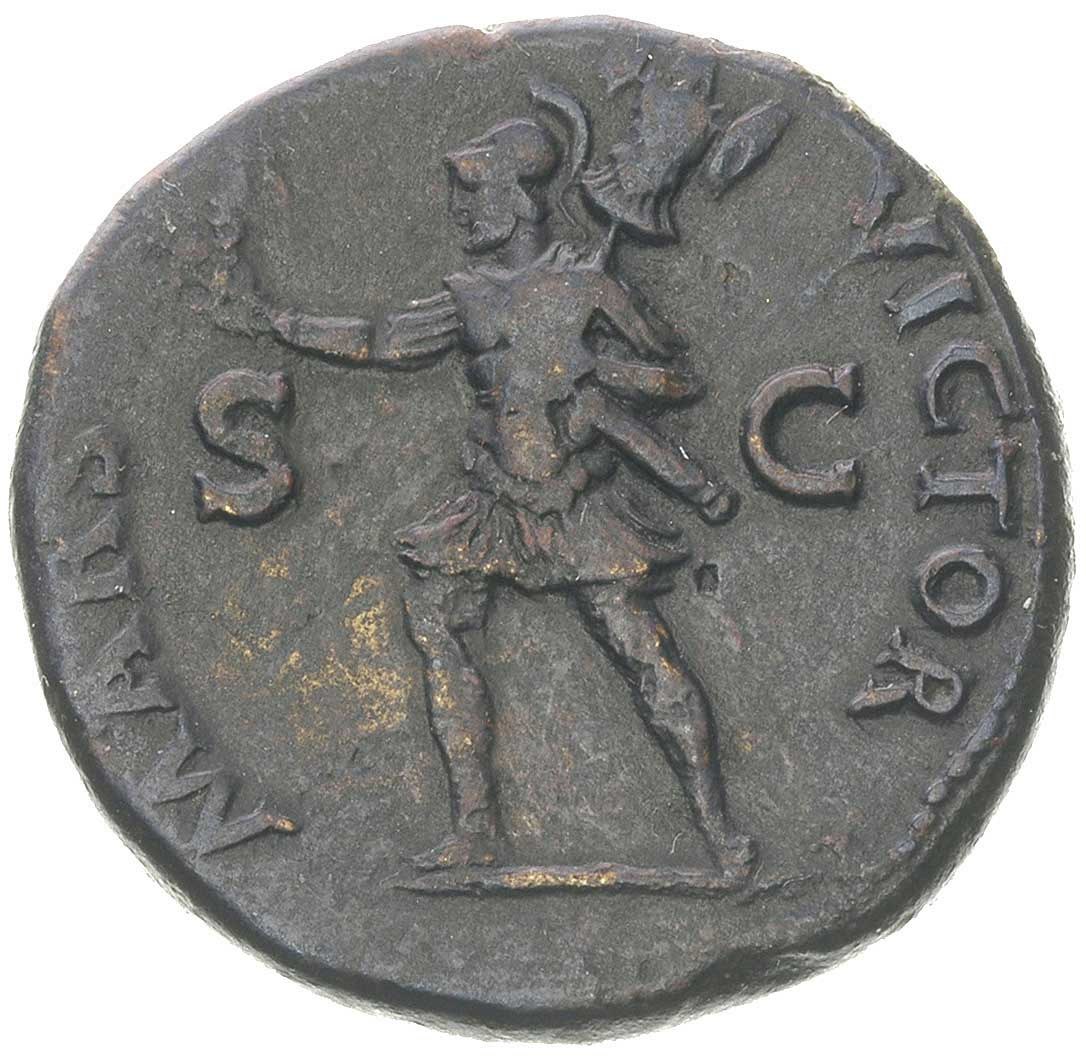 CESARSTWO RZYMSKIE, Wespazjan 69-79. sesterc, Aw: Popiersie w wieńcu w prawo i napis w otoku IMP CAES VESPAS AVG P M TR P PP COS III, Rw: Mars w zbroi z trophaionem i wieńcem kroczący w lewo, napis w otoku MARS VICTOR, w polu S-C, Sear ME 2329, RIC 433, 25.64 g, piękny i wyrazisty portret cesarza, delikatna patyna