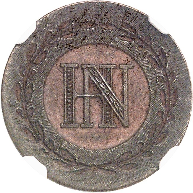 Av. Couronne formée de deux branches, en creux, au centre de laquelle est le monogramme HN.