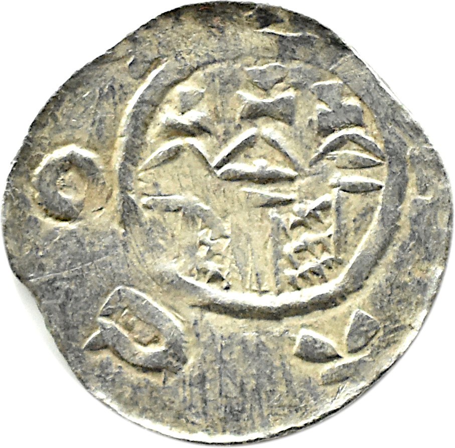 rewers: trzy-wieżowa budowla w wewnętrznym otoku, wokół litery