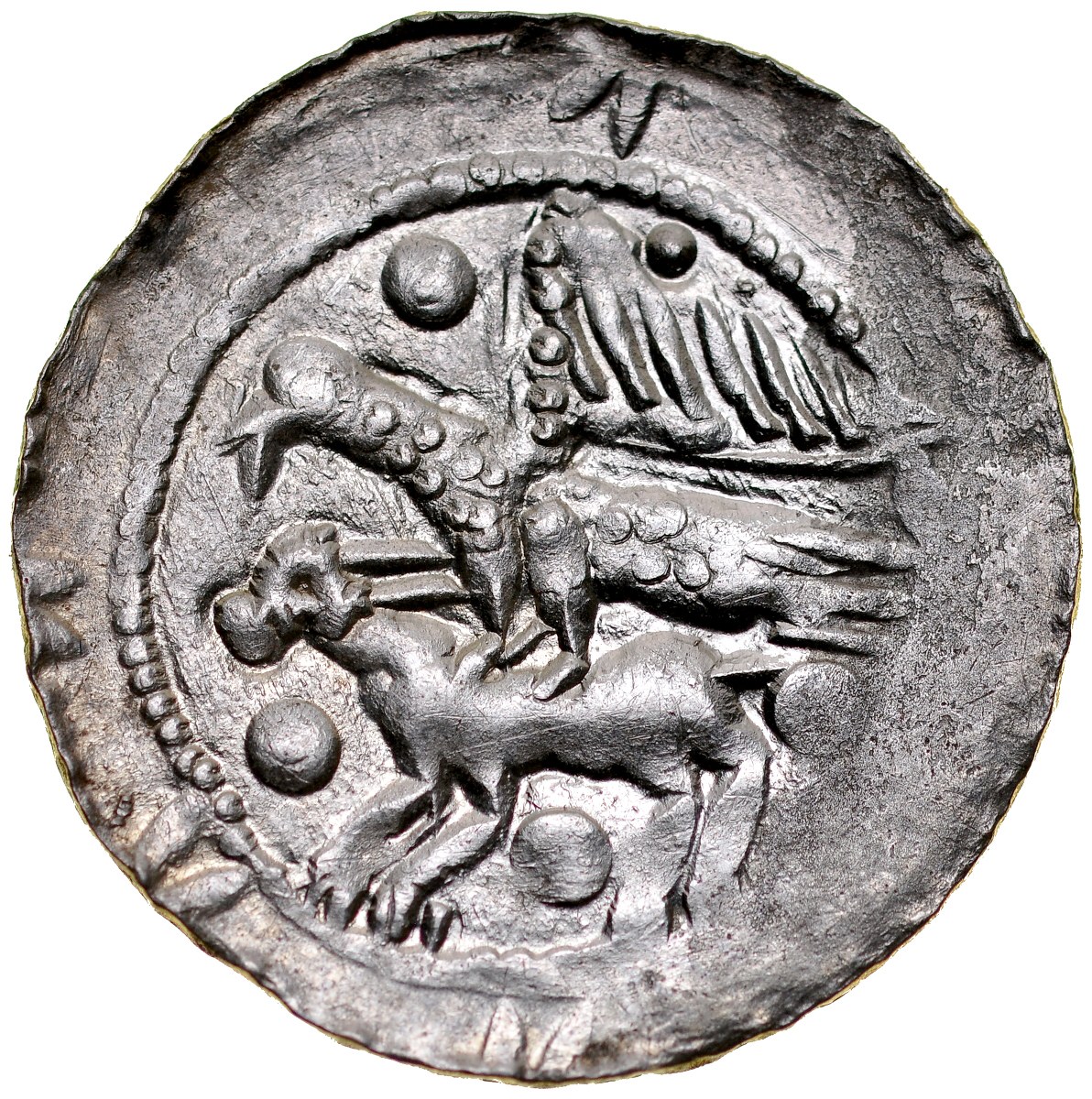 Władysław II Wygnaniec 1138-1146, Denar, Av.: Książę i jeniec, za nim w polu 4 duże kropki, Rv.: Orzeł i zając, w polu 5 kropek.