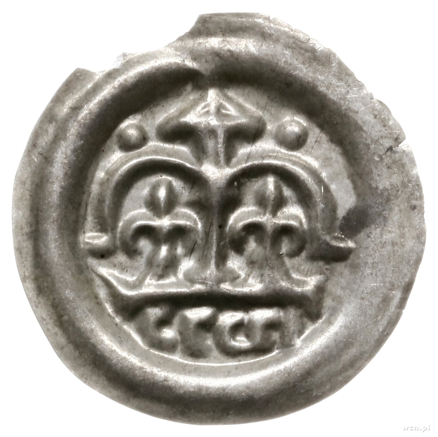 Krakowskie, Władysław Laskonogi 1202-1231 lub następcy; brakteat, 1202-1202/1206 lub 1228-1231, mennica Kraków; Para arkad z parą lilii, między nimi kolumna zwieńczona małą wieżą ze spiczastym dachem, z boków wieży po kulce, w odcinku wstecznie napis (bracha) בדכה; Gorlińska typ 41, BRP Gśl. 21, H-P 16, Hacz. 16; srebro, 14.3 mm, 0.07 g; niewielkie wykruszenie kołnierza, pięknie zachowana moneta z dużym blaskiem menniczym