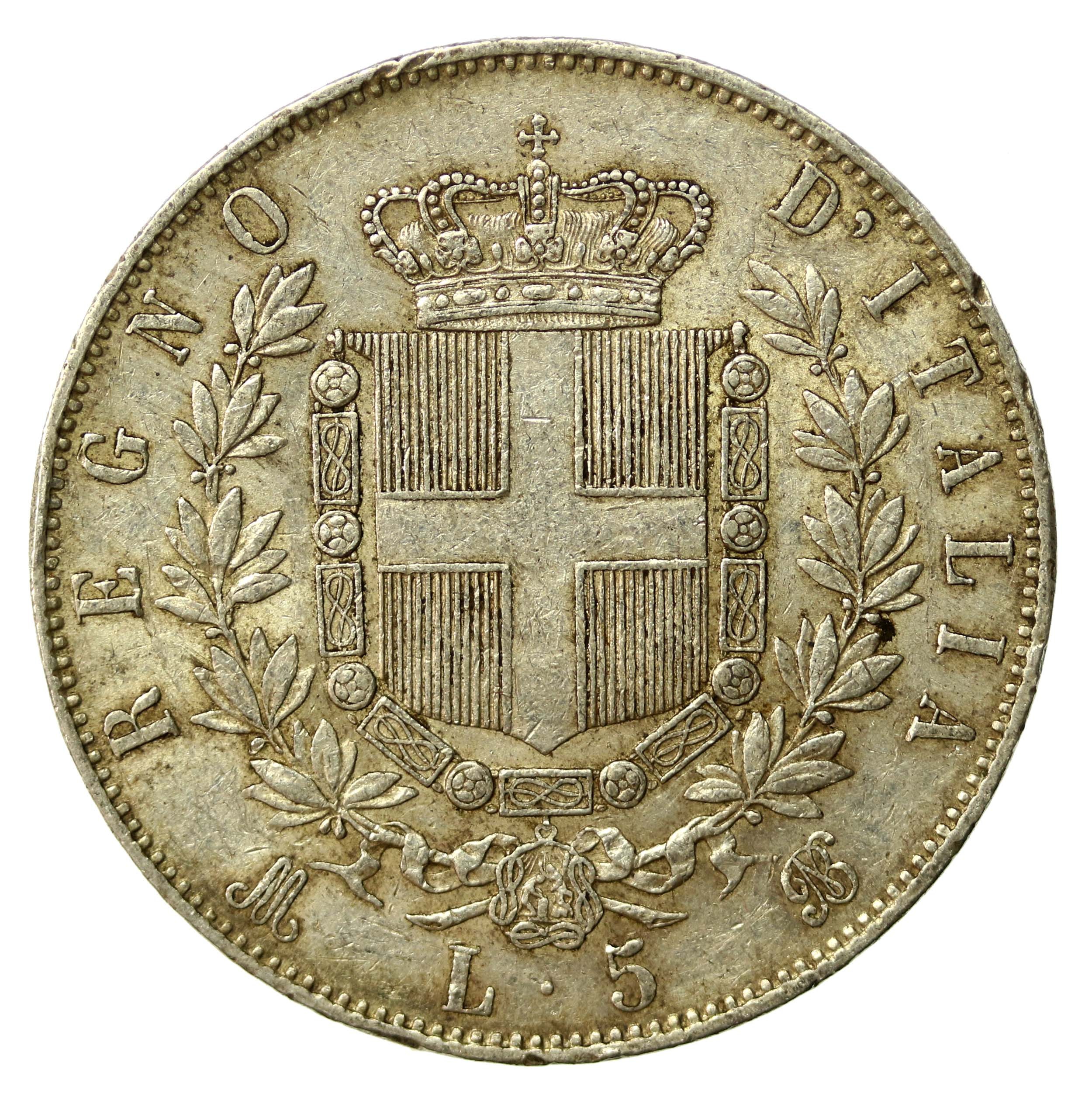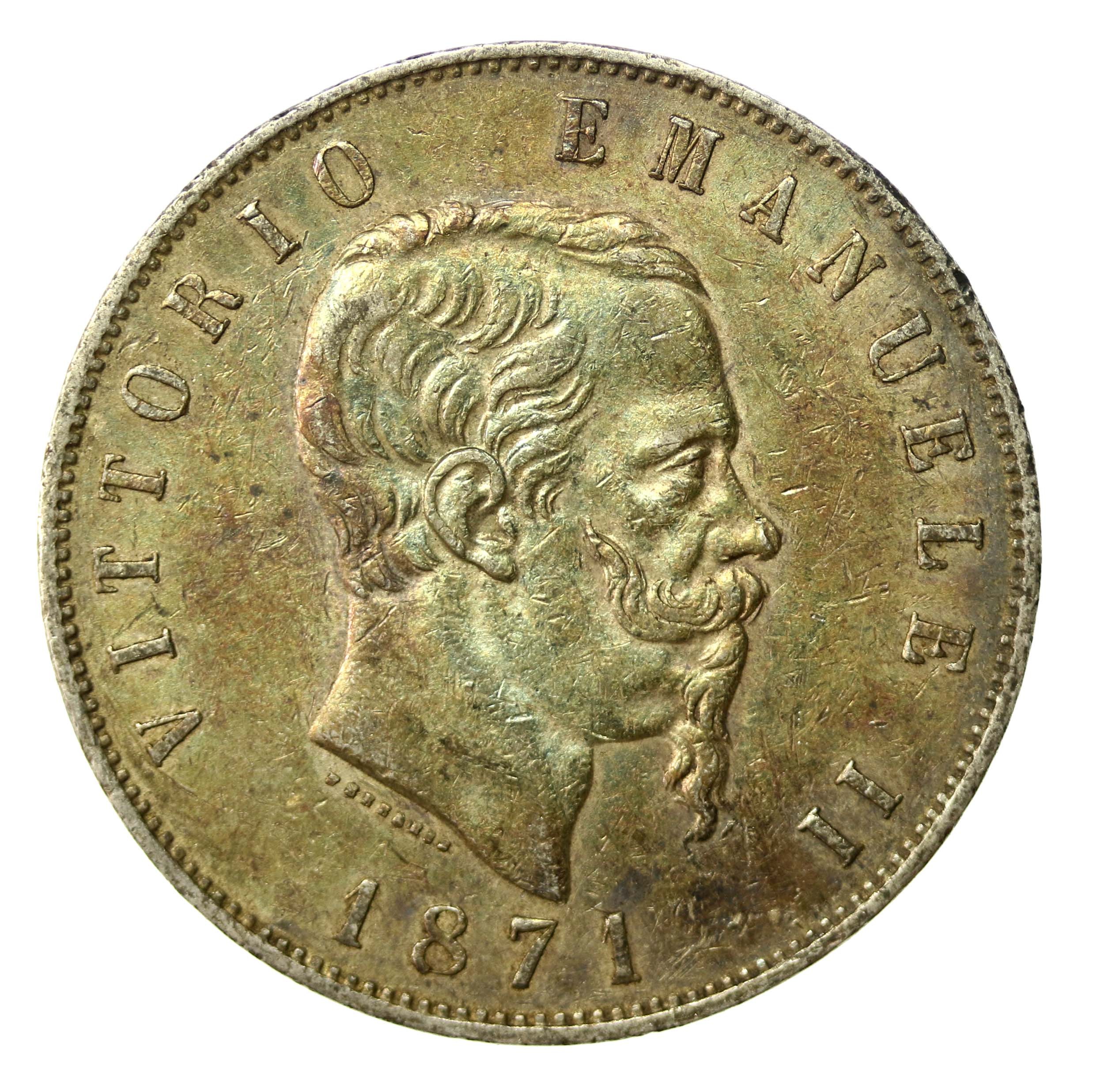 Włochy, Wiktor Emanuel II, 5 lirów 1871, Milan. Srebro próby 900. Waga katalogowa 25g. Stan zachowania: 2-