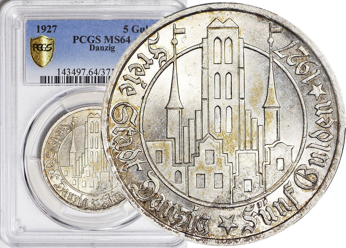 Wyśmienity menniczy egzemplarz. Mocny połysk w tle. Wyśmienita prezencja ogólna. Rzadszy rocznik. Istnieją tylko dwa egzemplarze pięcioguldenówki z 1927 roku ogradowane wyżej, MS 65, jeden w PCGS drugi w NGC. Jedną z tych monet wystawialiśmy na naszej 8 Aukcji we wrześniu 2018. Została tam ona sprzedana za ponad 31 000 zł. Oferowany tutaj egzemplarz zadowoli gusta najbardziej wybrednych kolekcjonerów. Polecamy do najlepszych kolekcji.