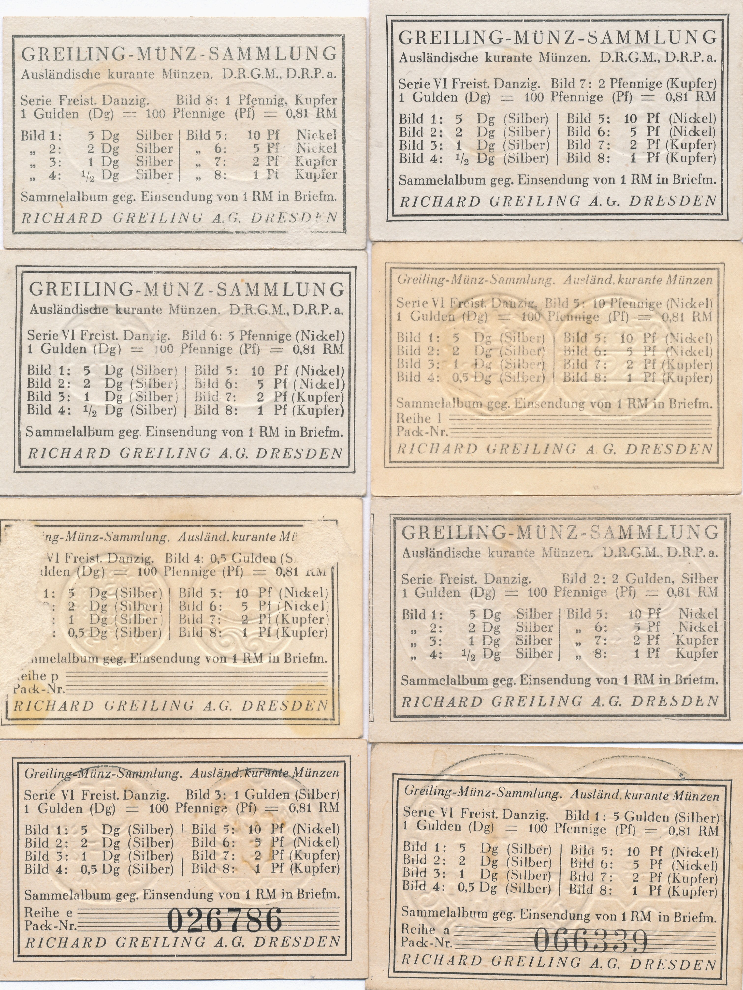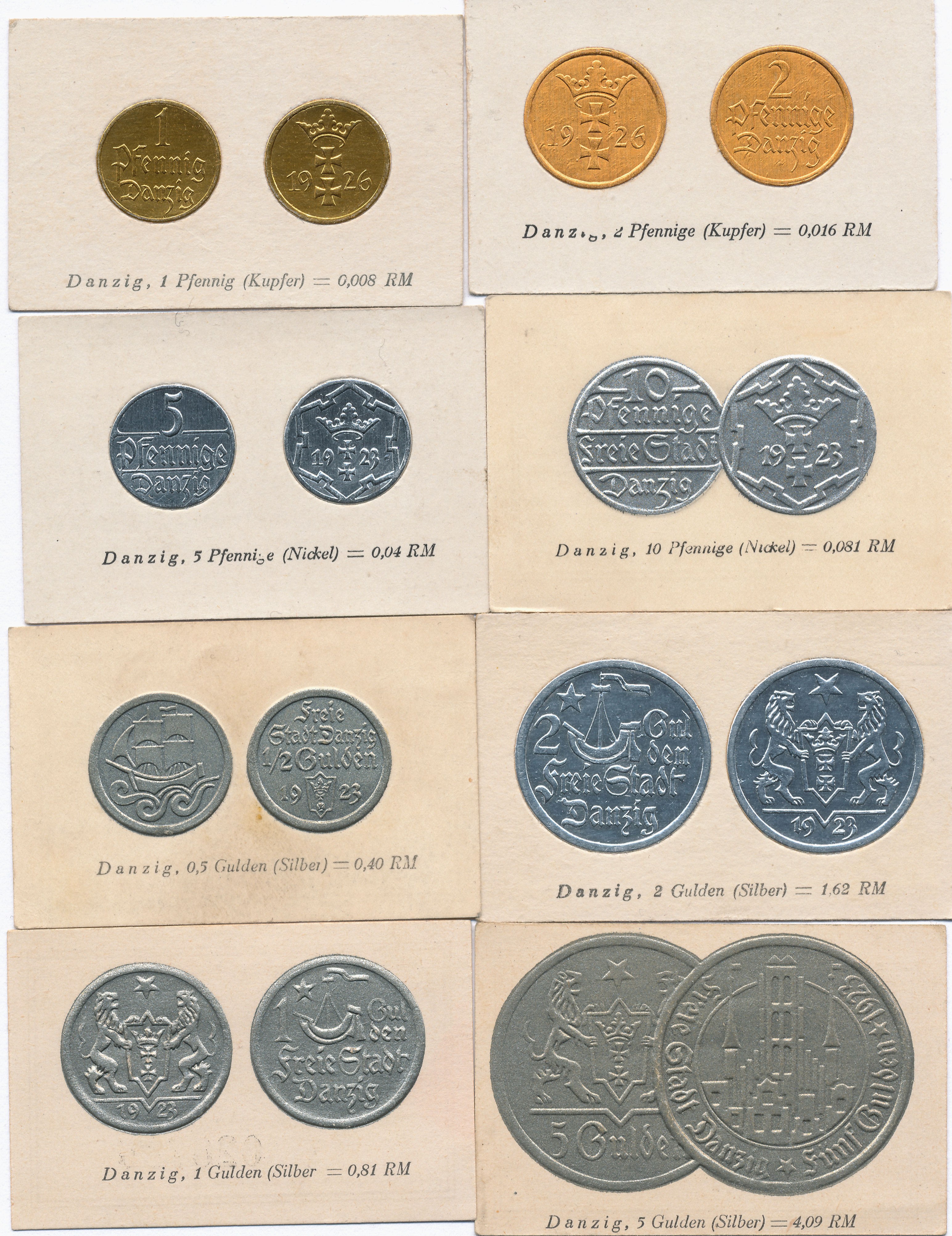 Przedstawione wizerunki monet Wolnego Miasta Gdańska z 1923 roku, od 1 feniga po 5 guldenów., 2 sztuki numerowane.