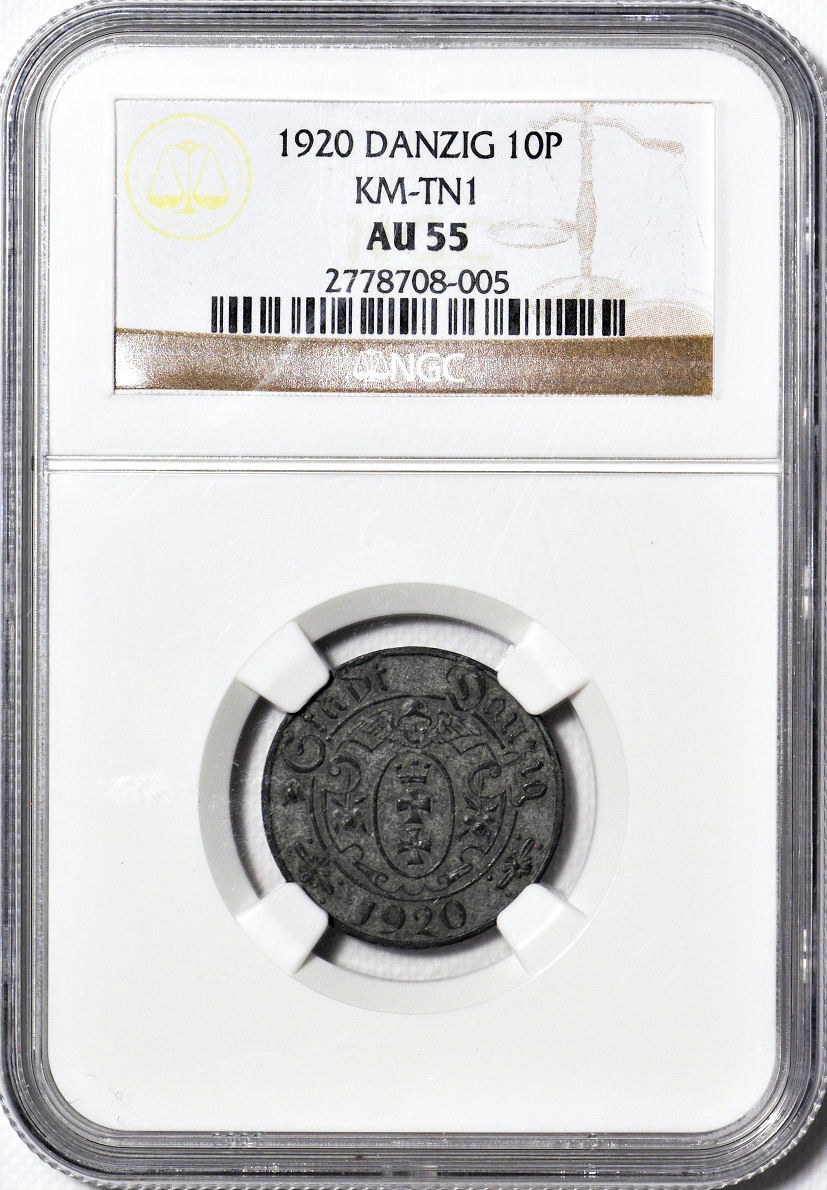 Wolne Miasto Gdańsk, 10 fenigów 1920 odmiana 58 perełek (58.1/2), okołomennicze