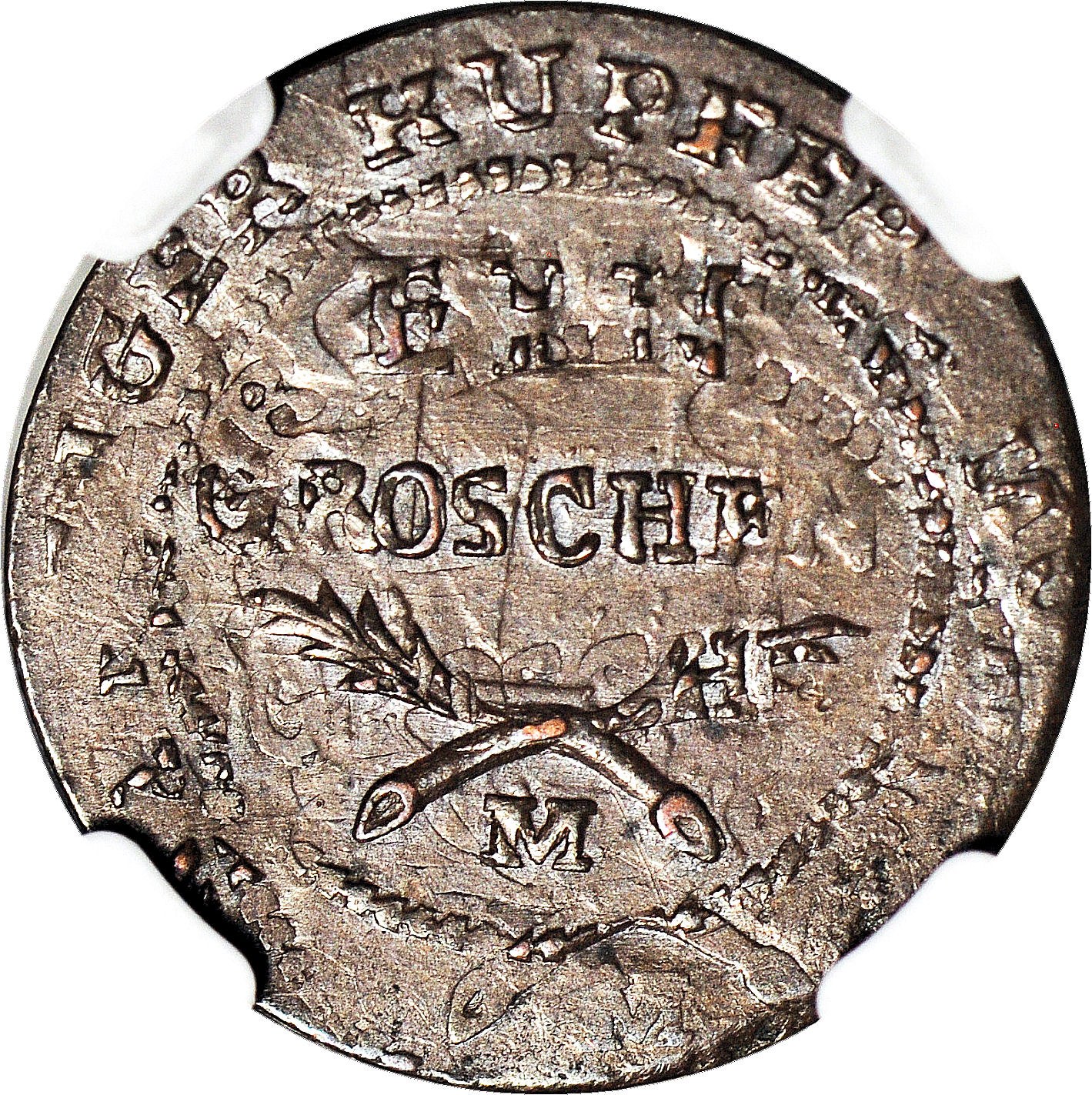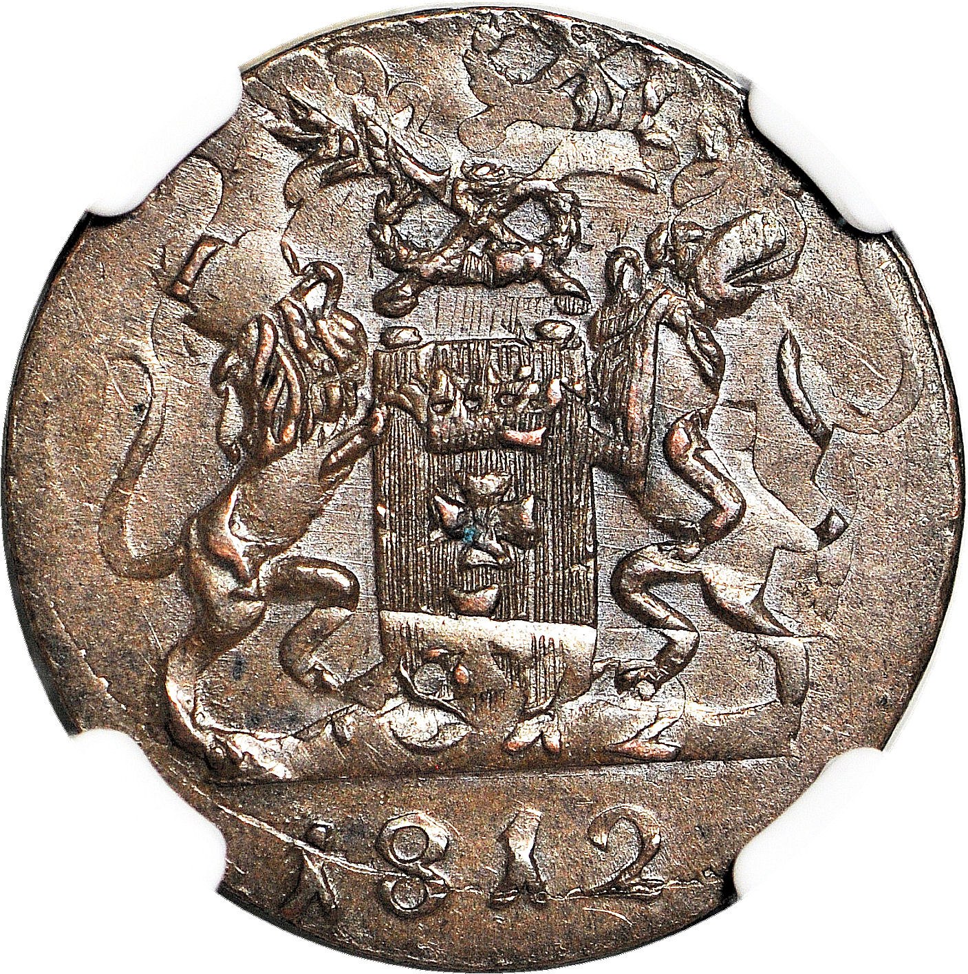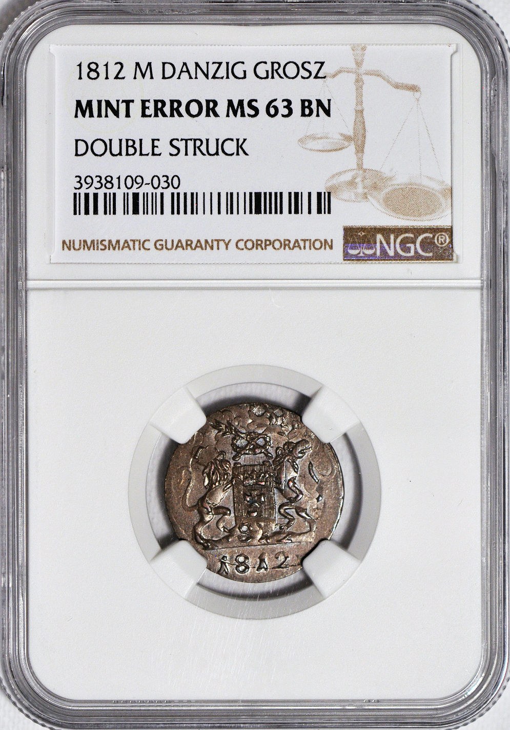 Najwyższa nota, zarazem jedyny grosz Gdański z 1812 wygradowany w NGC, w MS63. Piękny i rzadki przykład podwójnego bicia, szczególnie dobrze widocznego na awersie - dwie daty 1812! Obiegowe szelągi i grosze Wolnego Miasta Gdańska(1807-1814), w notach menniczych to monety bardzo rzadkie, a w wysokich notach MS to wręcz unikaty, brakujące w tych stanach nawet w największych kolekcjach. Niewiele rzadszy grosz gdański z 1809 roku w nocie MS63 został sprzedany w tym roku na 19 aukcji ANMN poz 1230 za 12.650zł.