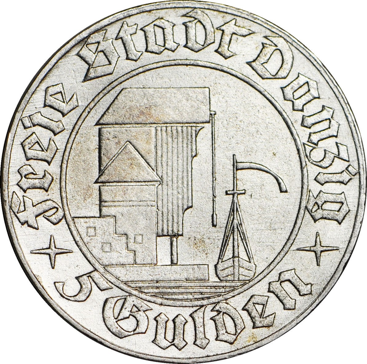 Menniczy egzemplarz, połysk menniczy, wspaniałe detale subtelna patyna. Świetna prezencja ogólna. 5 guldenów z wizerunkiem Żurawia gdańskiego. Jedna z najrzadszych i najtrudniejszych do zdobycia w pięknym stanie monet WMG. Mennica Berlin. Poszukiwany numizmat.