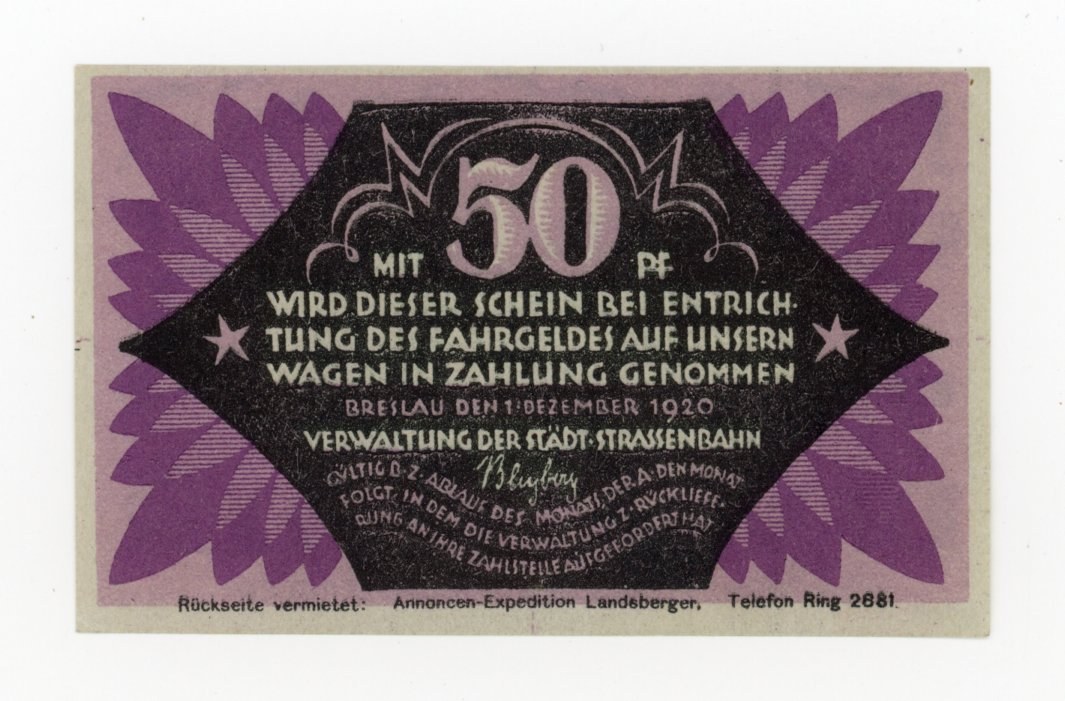 Wrocław/Breslau, Strassenbahn, 50 fenigów 1920