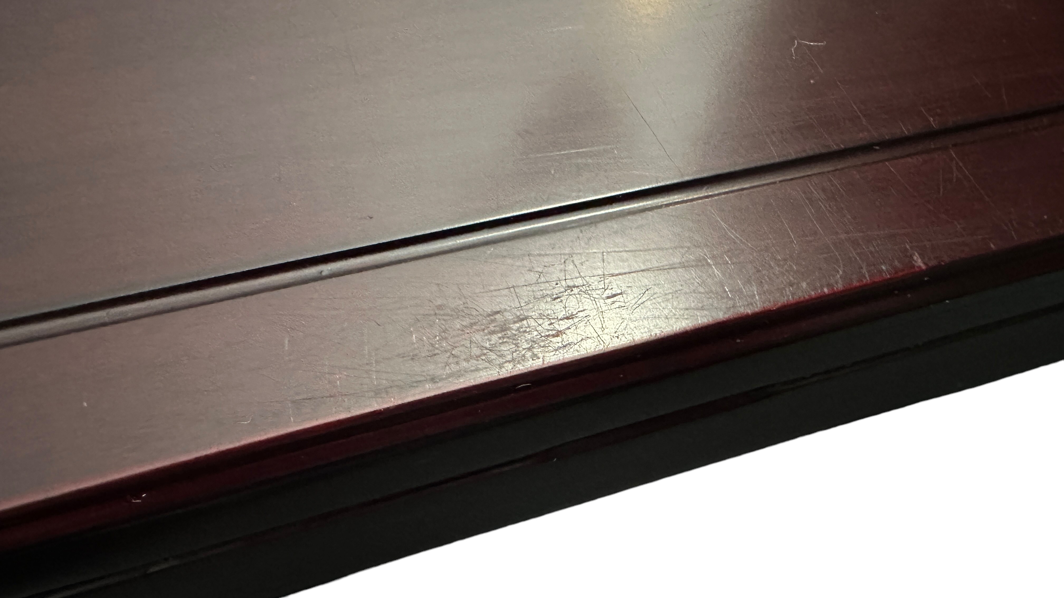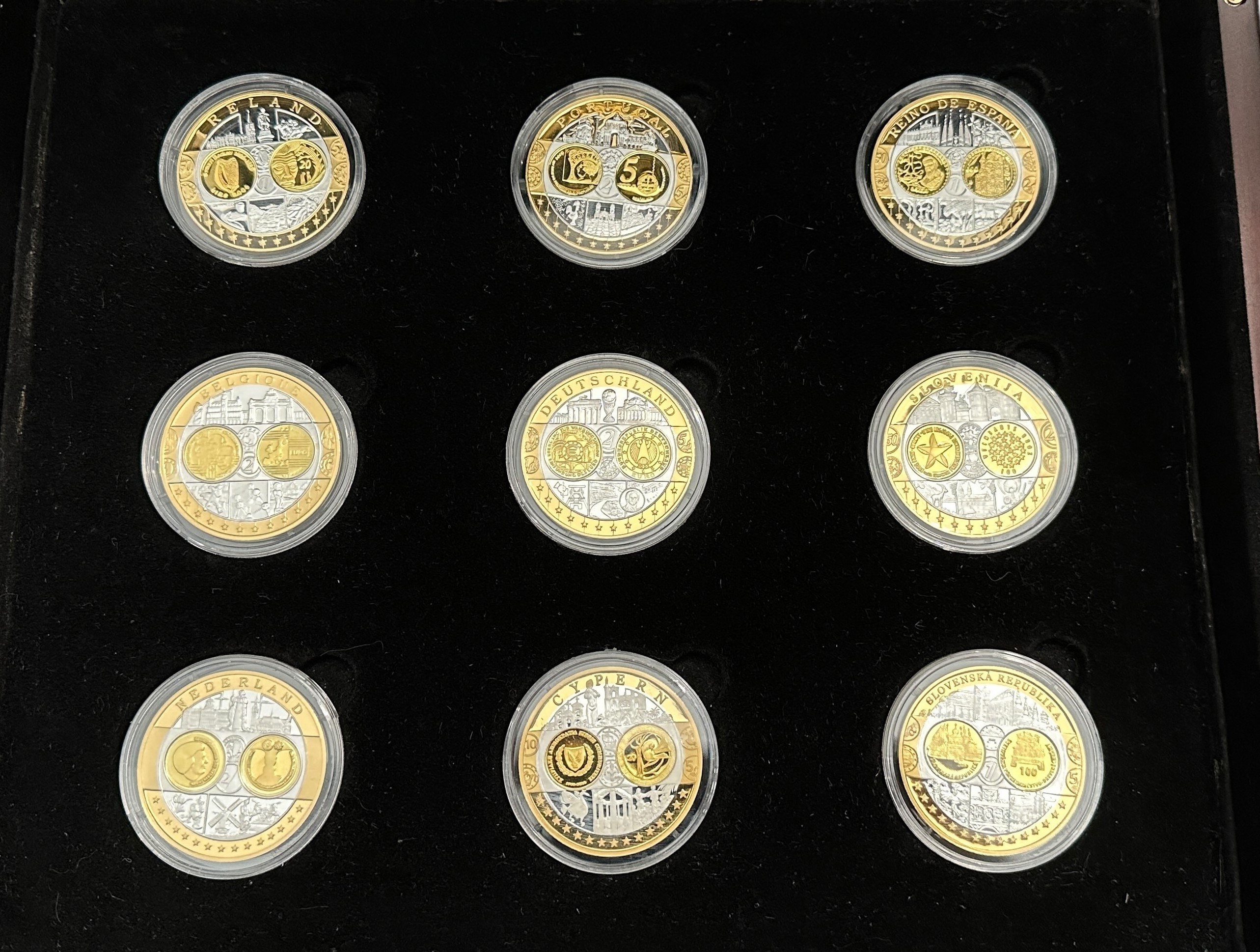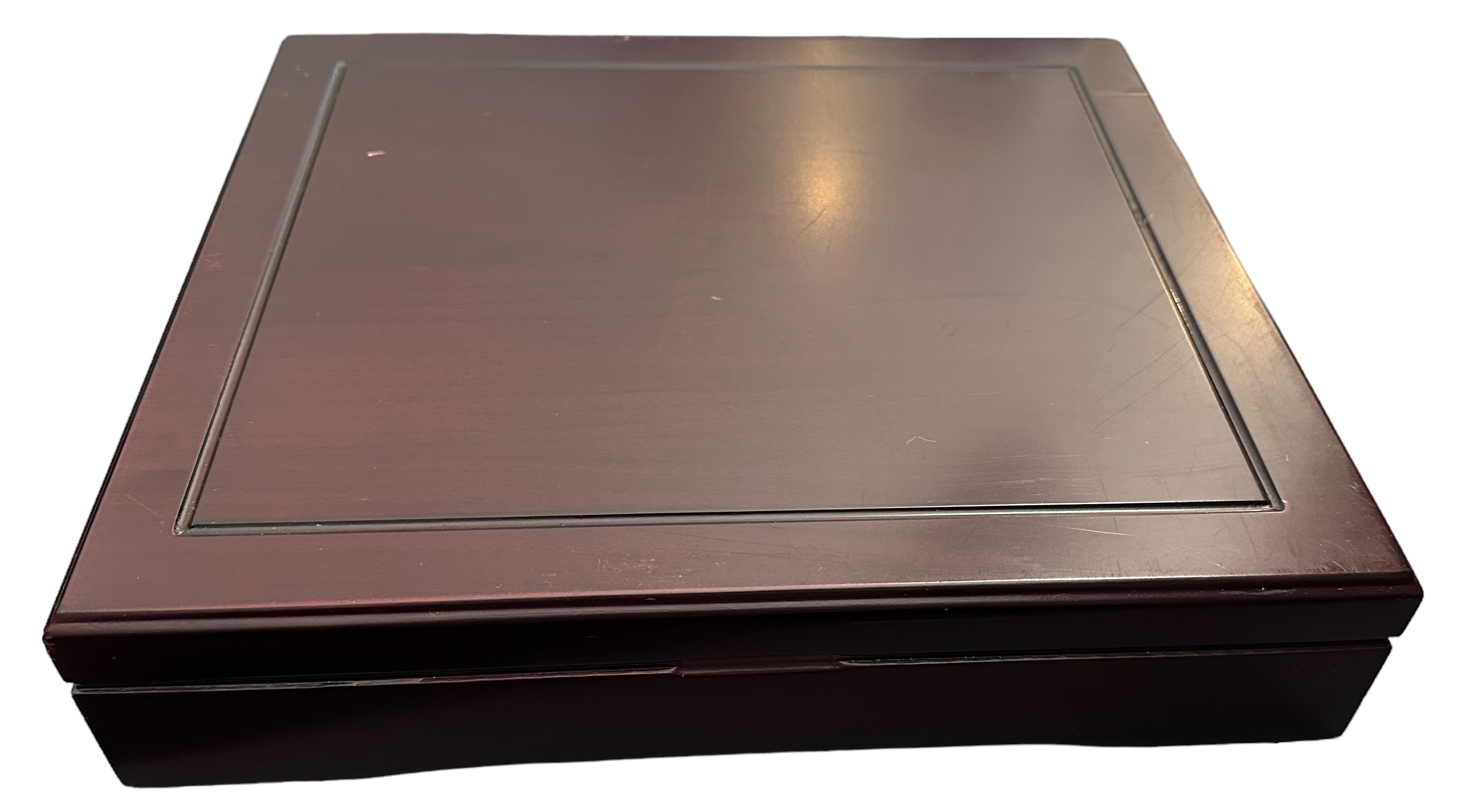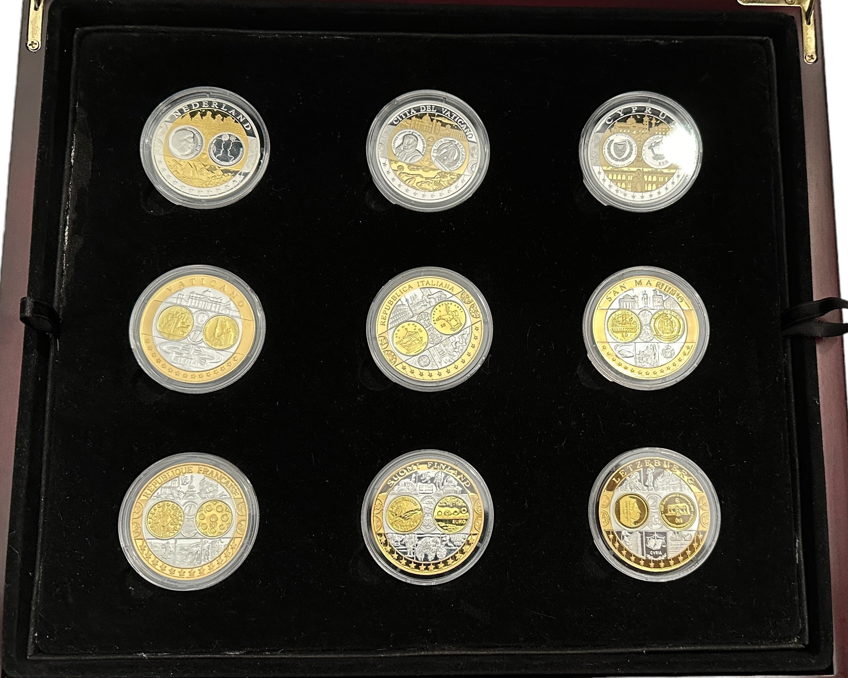 Zestaw monet w dedykowanym drewnianym pudełku z widocznymi uszkodzeniami.
