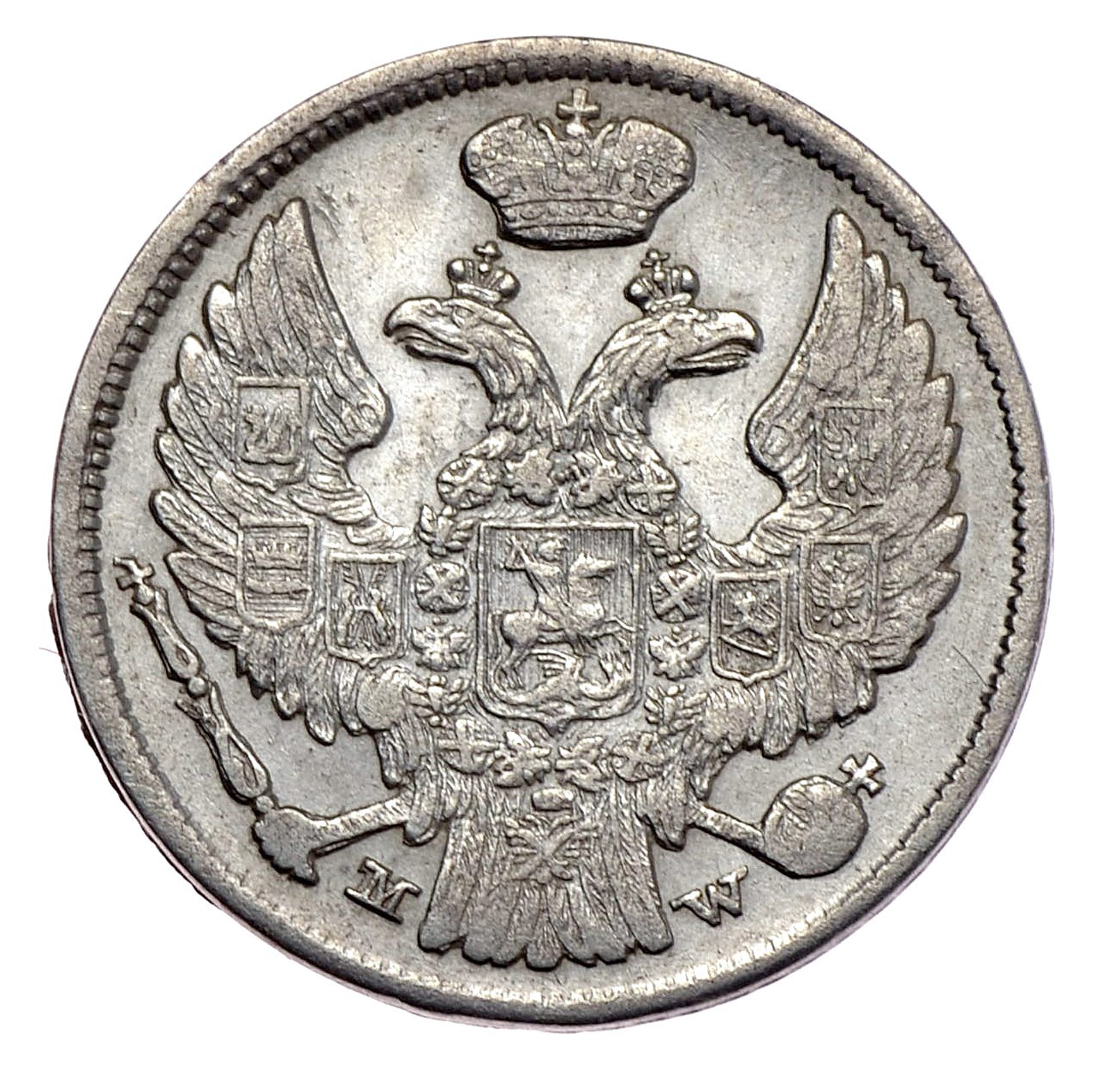 Delikatne, ale widoczne zdwojenie litery M i berła,