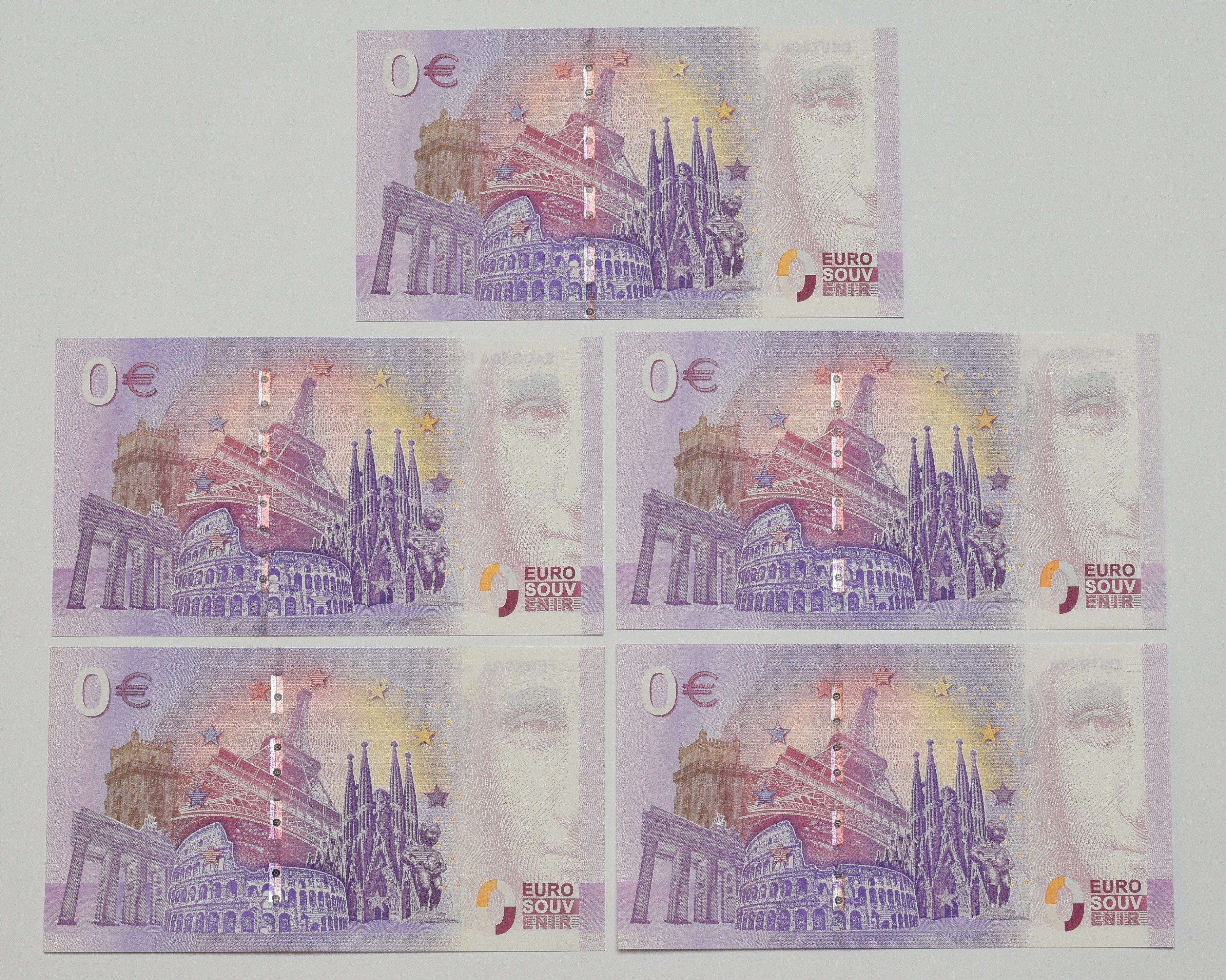 Zestaw 5 różnych banknotów o nominale 0 Euro.