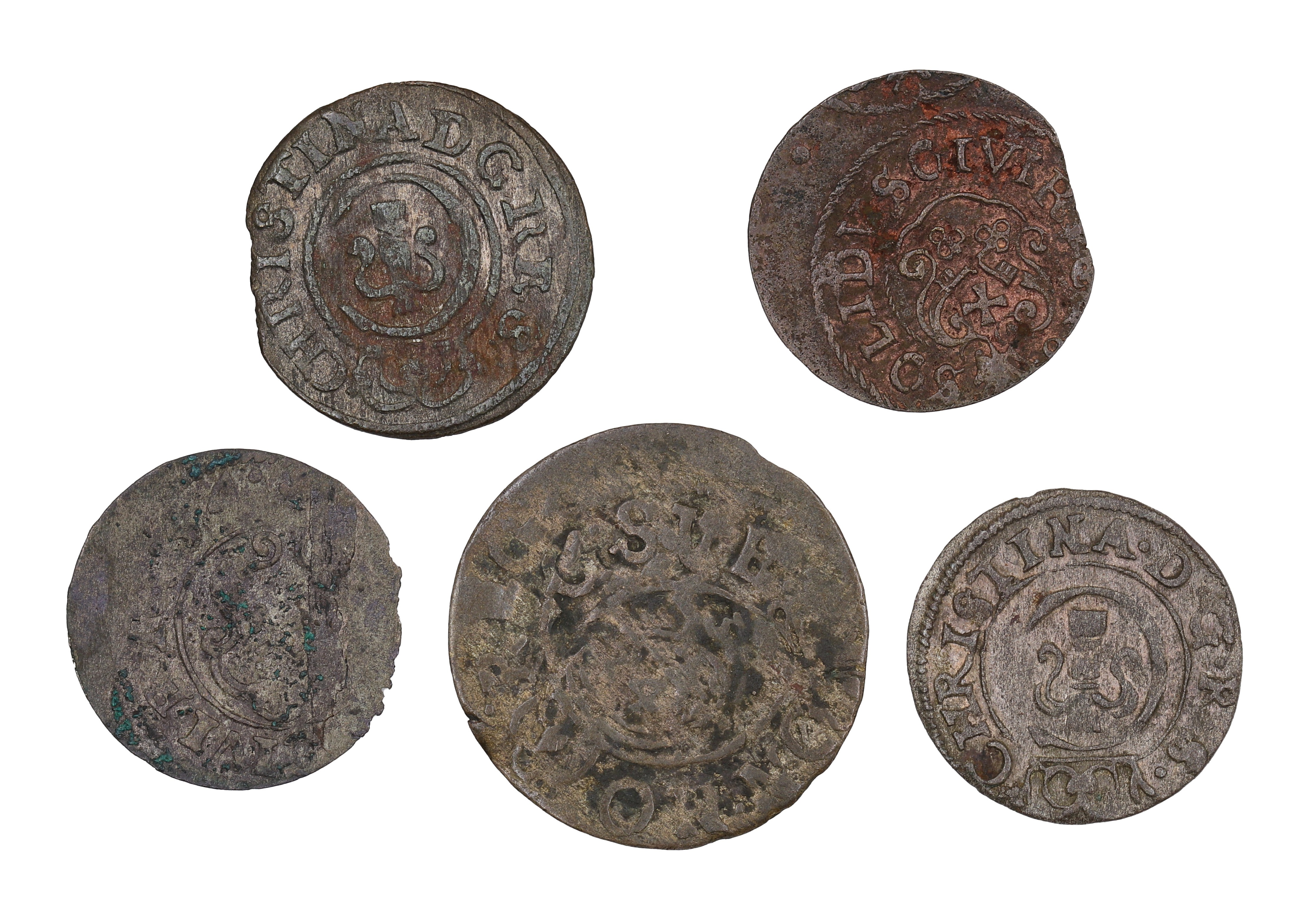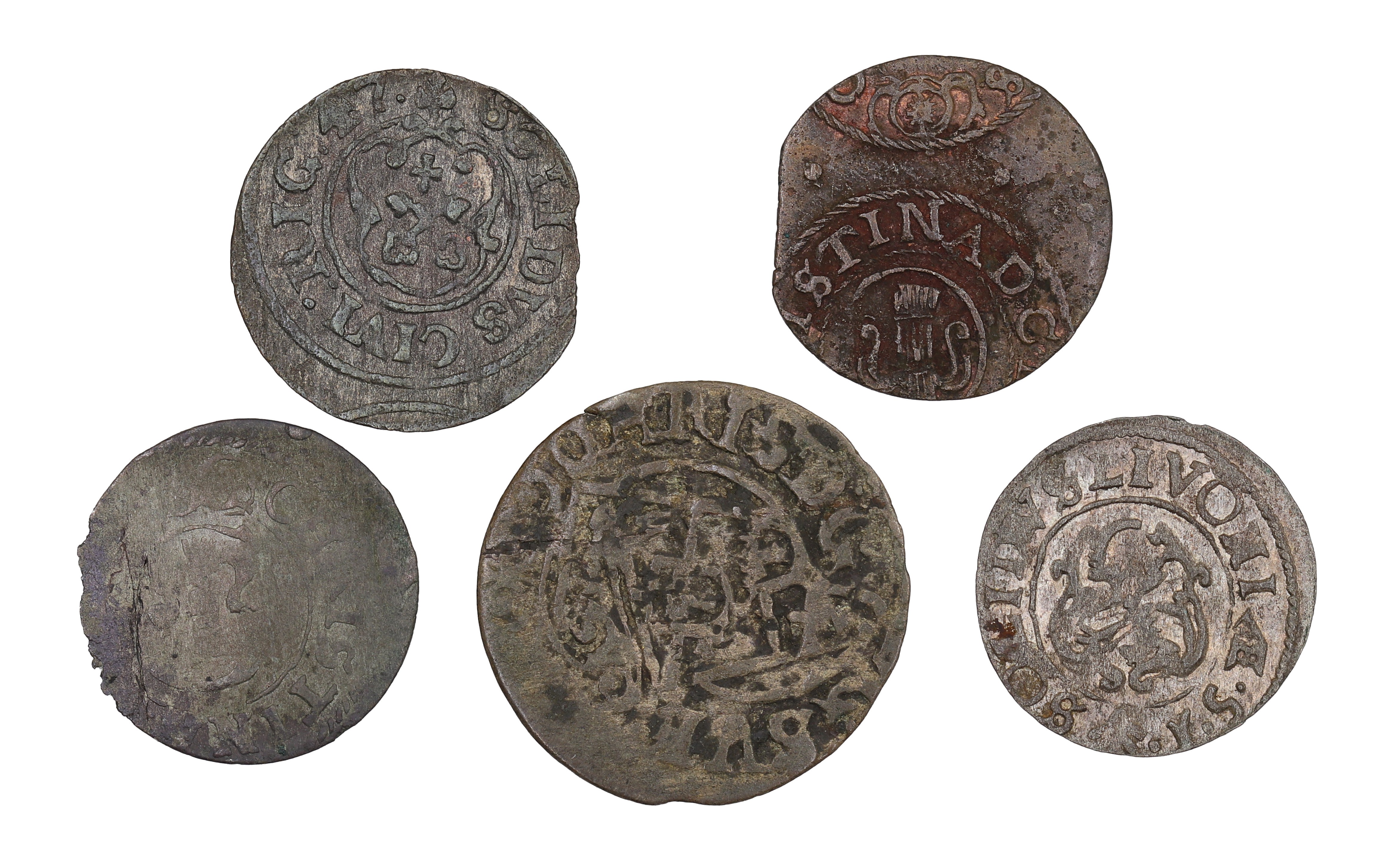 W skład zestawu wchodzą: szelągi 1651 r. i 1654 r. - Inflanty, szeląg 1647 r., szeląg (data?), półtorak (data?) - Ryga