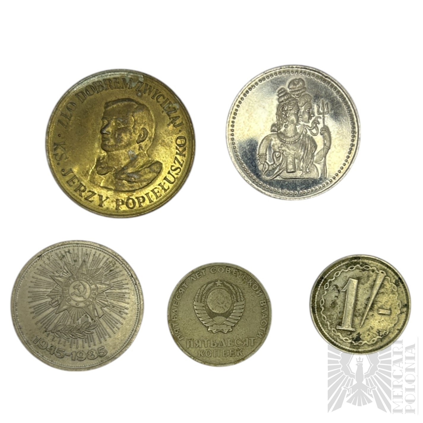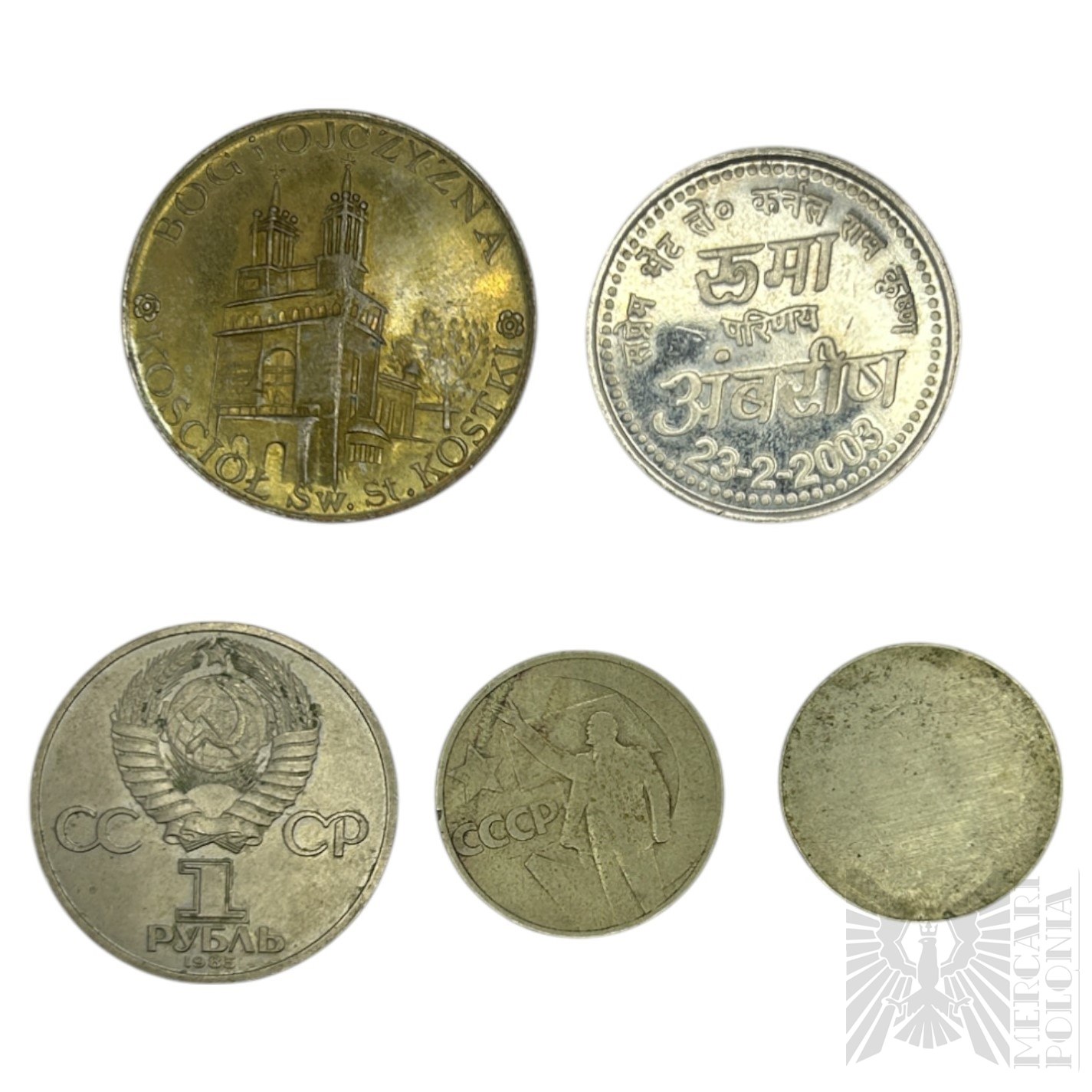 Zestaw Monet: Jeden Rubel, Token Jednopensowy, Pamiątkowy Medal Jerzy Popiełuszko, Indyjska Moneta Okolicznościowa z Postacią Rumā