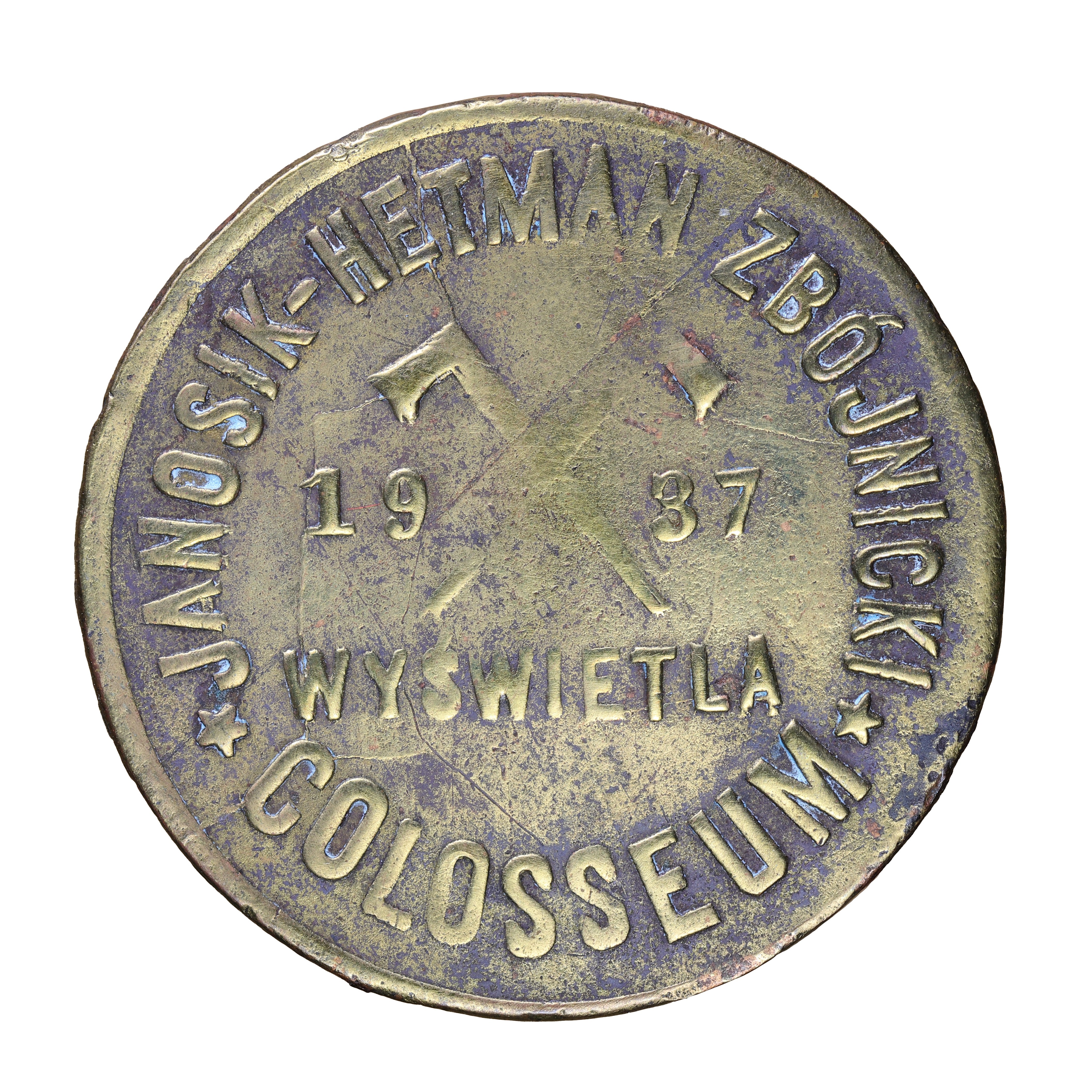 Żeton reklamowy filmu "Janosik - hetman zbójnicki"; kino Coloseum - największe kino w Warszawie, działalo od 1916 r. przy ul. Nowy Świat 19