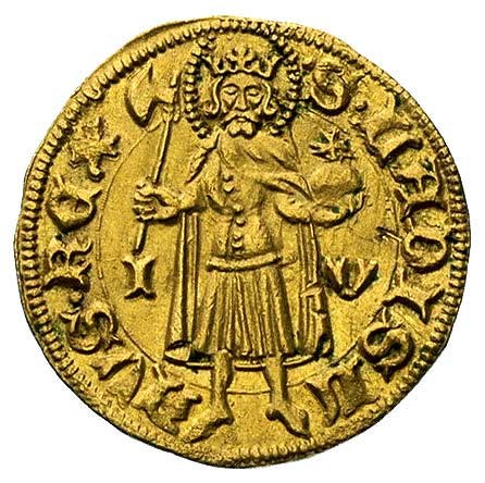 WĘGRY, Zygmunt 1387-1437, goldgulden- Buda, Aw: Tarcza herbowa i napis, Rw: Stojący św. Ładysław i napis, w polu I-V, Pohl D1-10, Fr. 9, złoto 3.52 g