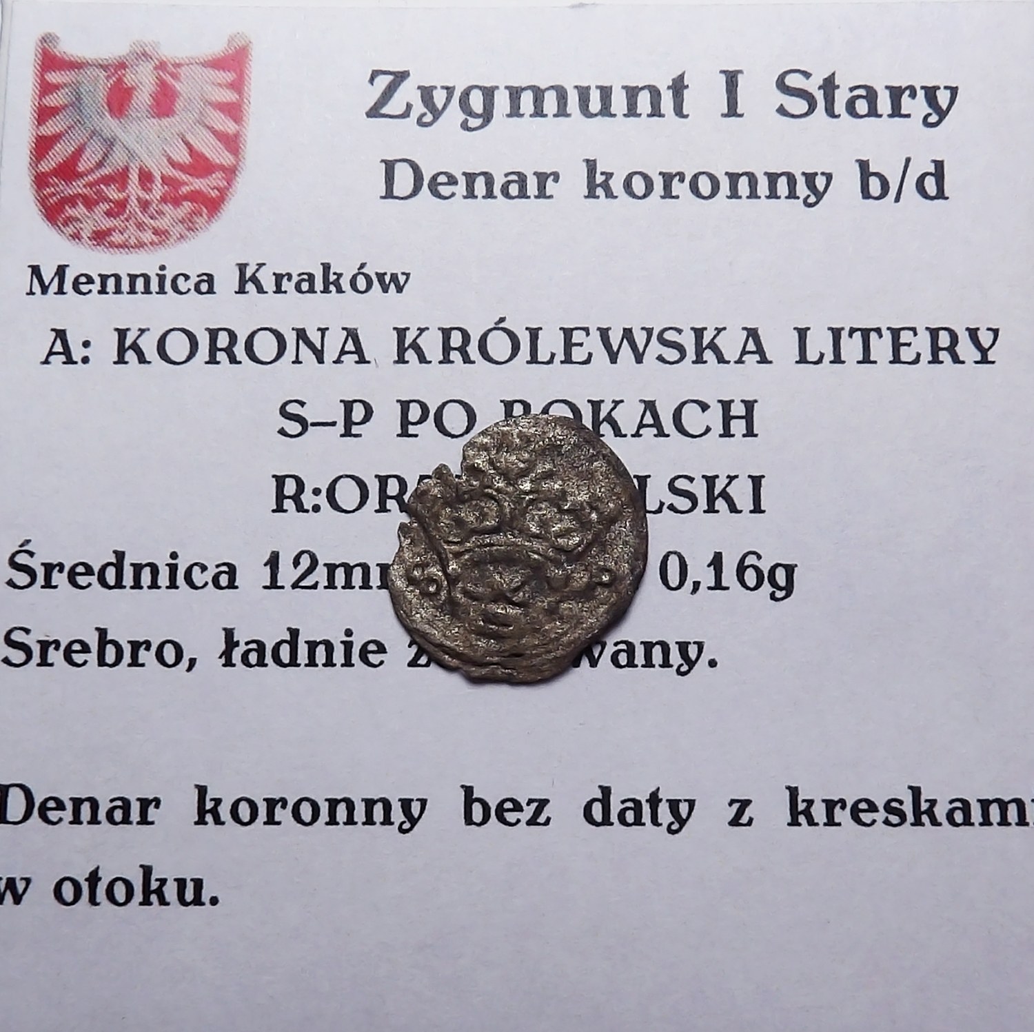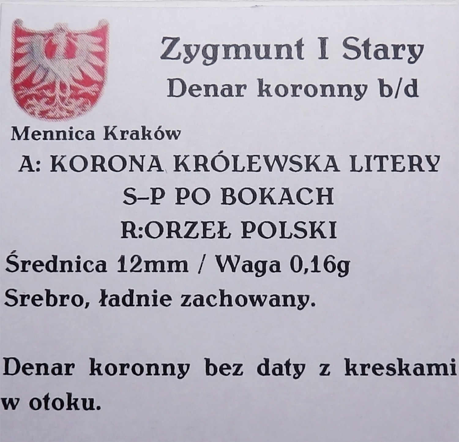 Wczesny denar Zygmunta Starego, wybity po reformie monetarnej z 1526 roku, najprawdopodobniej w latach 1527 - 1529. Na awersie wybito koronę z kreskami w otoku, błędnie określanymi jako “szable”. Kreski to graficzne odzwierciedlenie tyłu korony widocznej przez otok. Po bokach korony wybito listery S - P czyli skrót od słów SIGISMVNDVS PRIMVS (Zygmunt Pierwszy). Moneta znajduje się w kopertce na której widnieje opis legendy, średnica i waga oraz charakterystyczne cechy danego waloru.