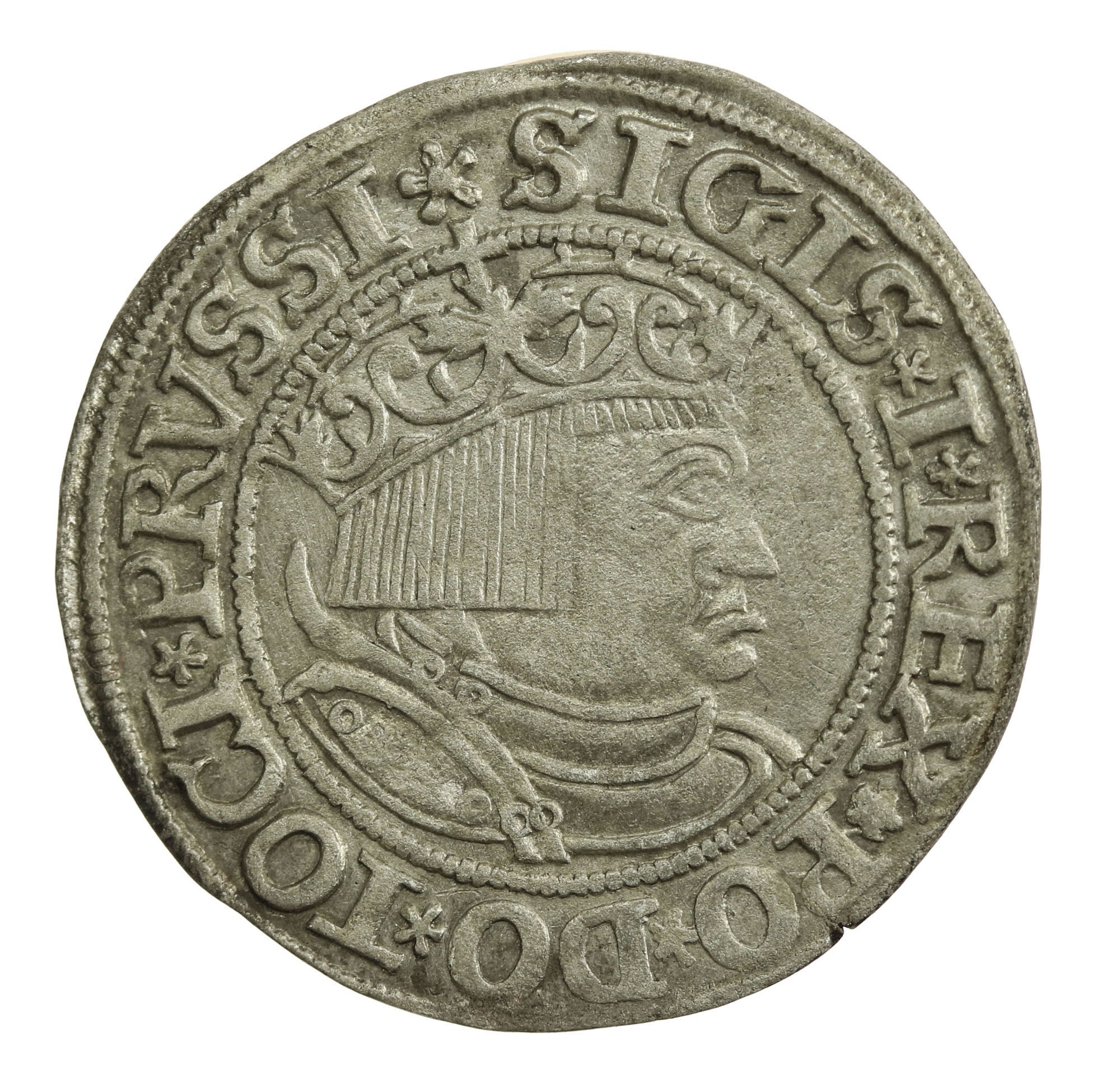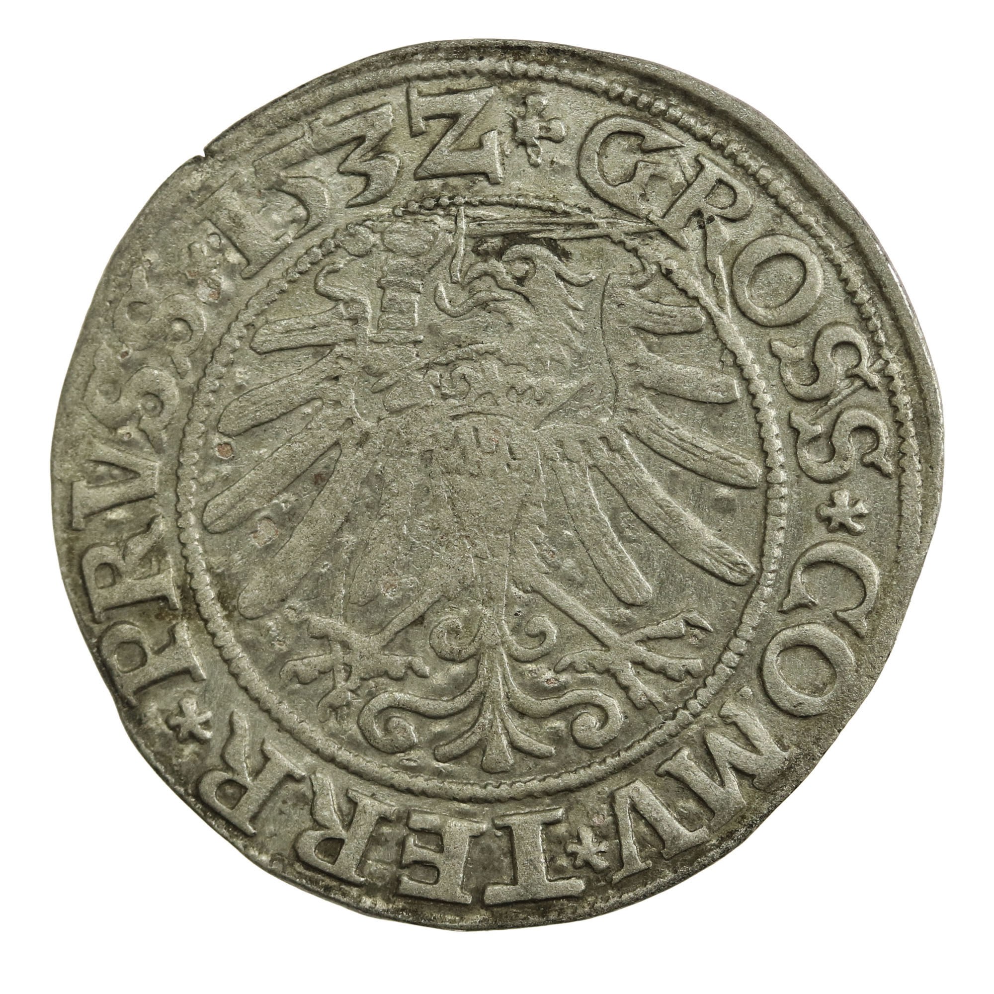 Zygmunt I Stary, grosz 1532, Toruń. Rzadsza odmiana legendowa PRVSSI/PRVSS. Stan 2-/3+. Patyna. Literatura: Kopicki 3087 (R)