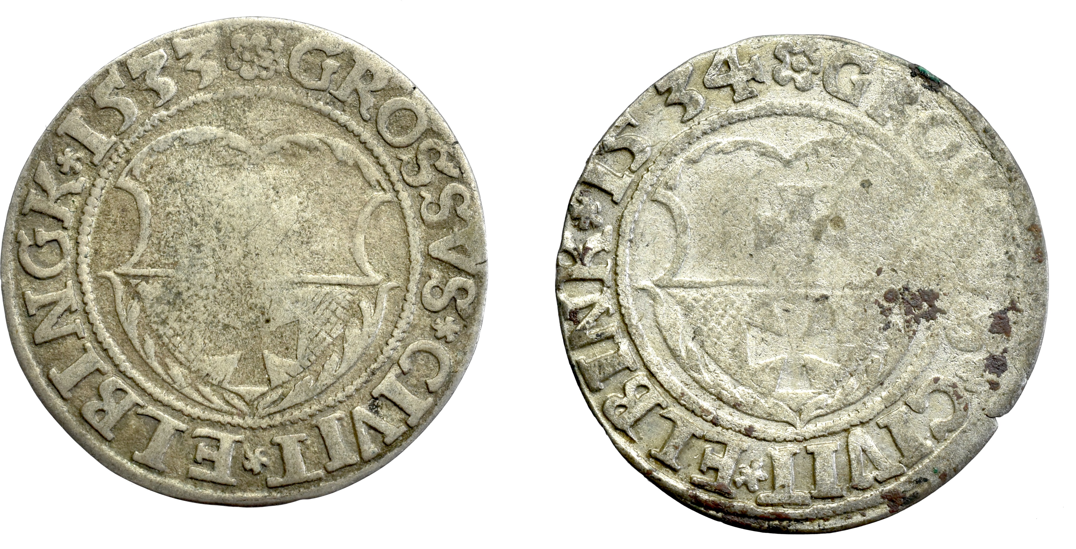 Dwa grosze Zygmunta I Starego z Elbląga. Poprawnie zachowane wybite w dwóch kolejnych latach panowania.