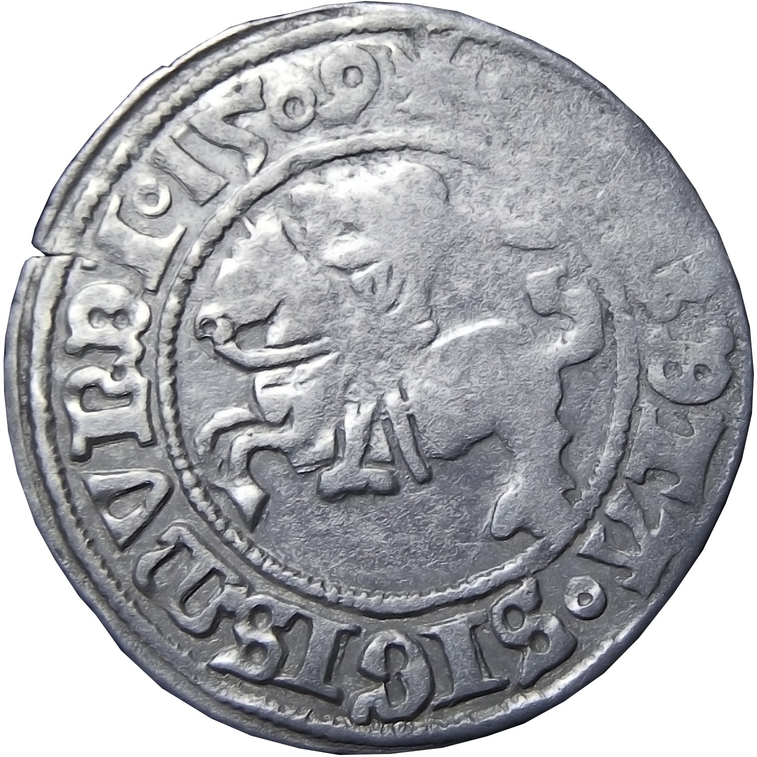 Półgrosz litewski wybity w 1509 roku w mennicy w Wilnie. Bardzo rzadki wariant z Pogonią z pochwą od miecza oraz z odwrotnym E w słowie