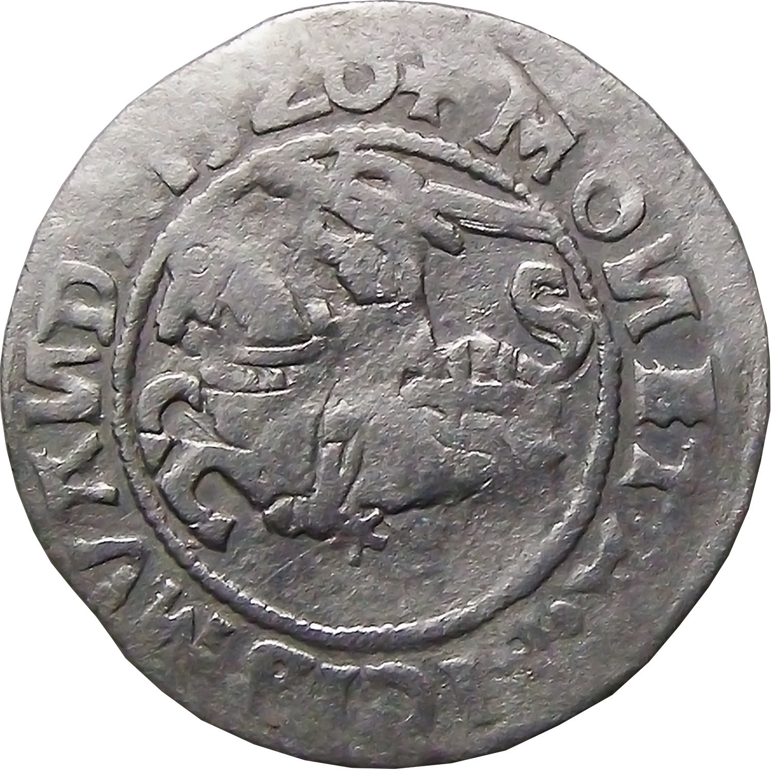 Półgrosz wybity w Wilnie dla Zygmunta I Starego w 1520 roku. Bardzo rzadki wariant z SIGISMVANDI i pięcio-kropkiem kończącym legendę rewersu.