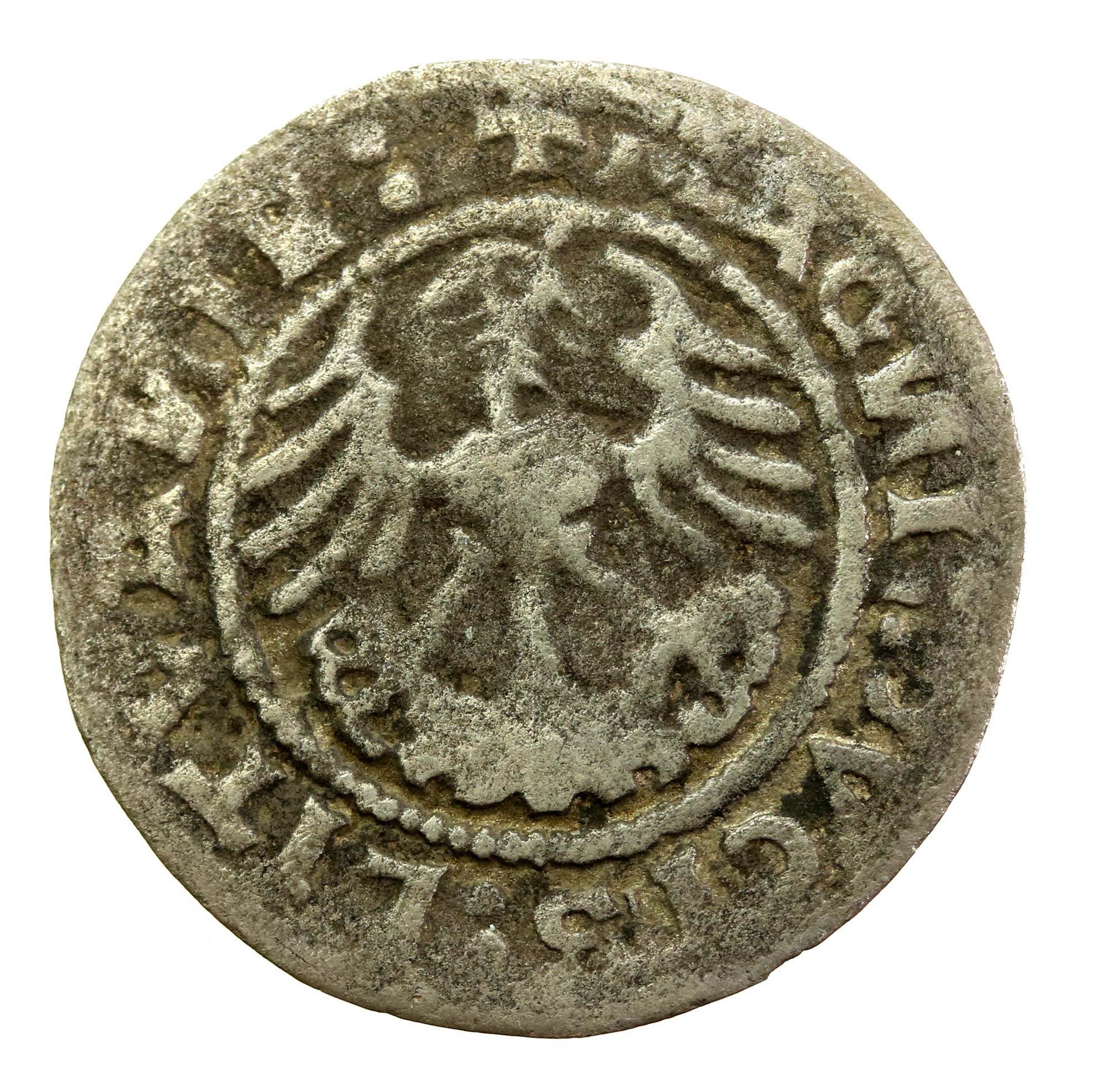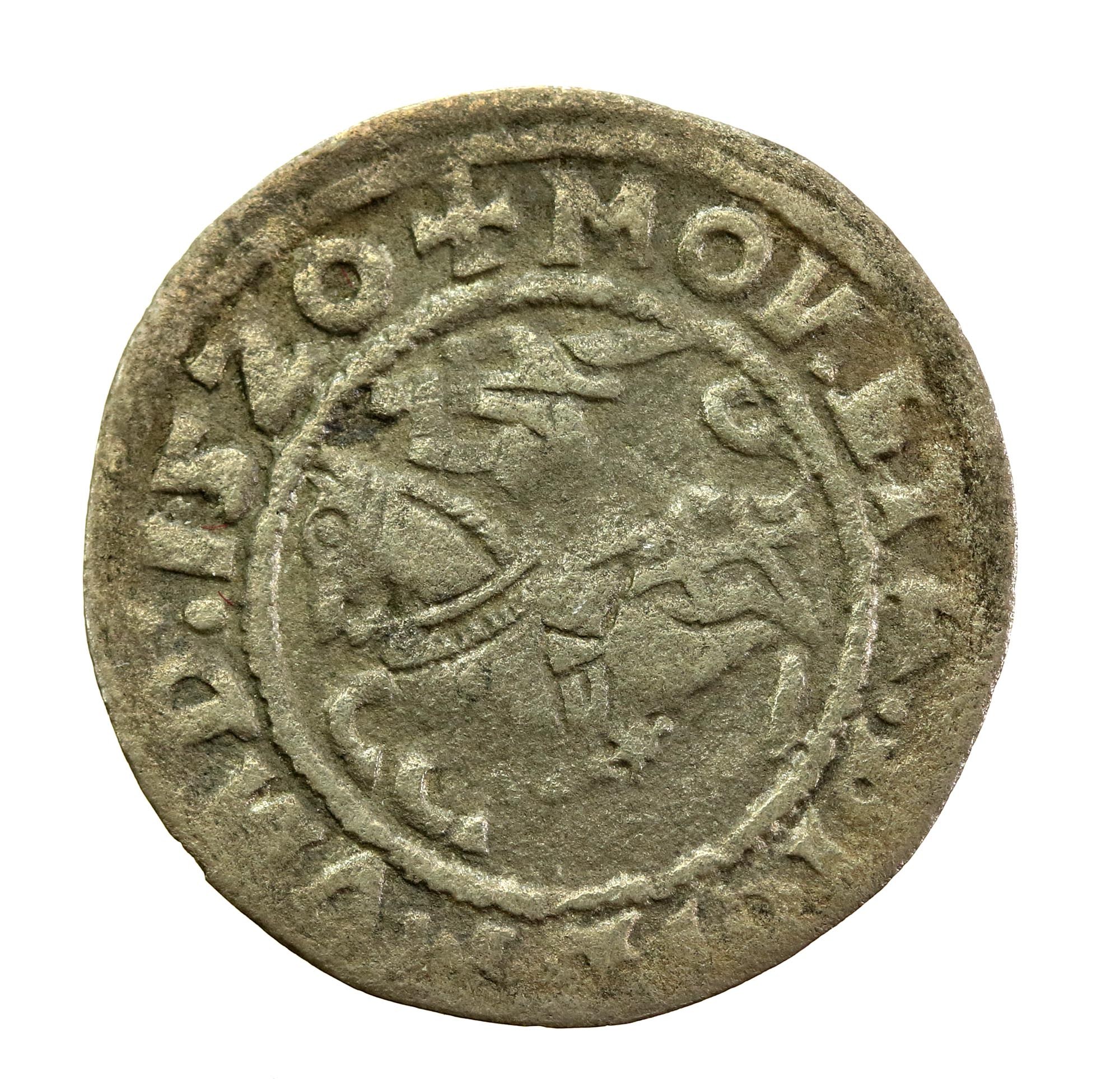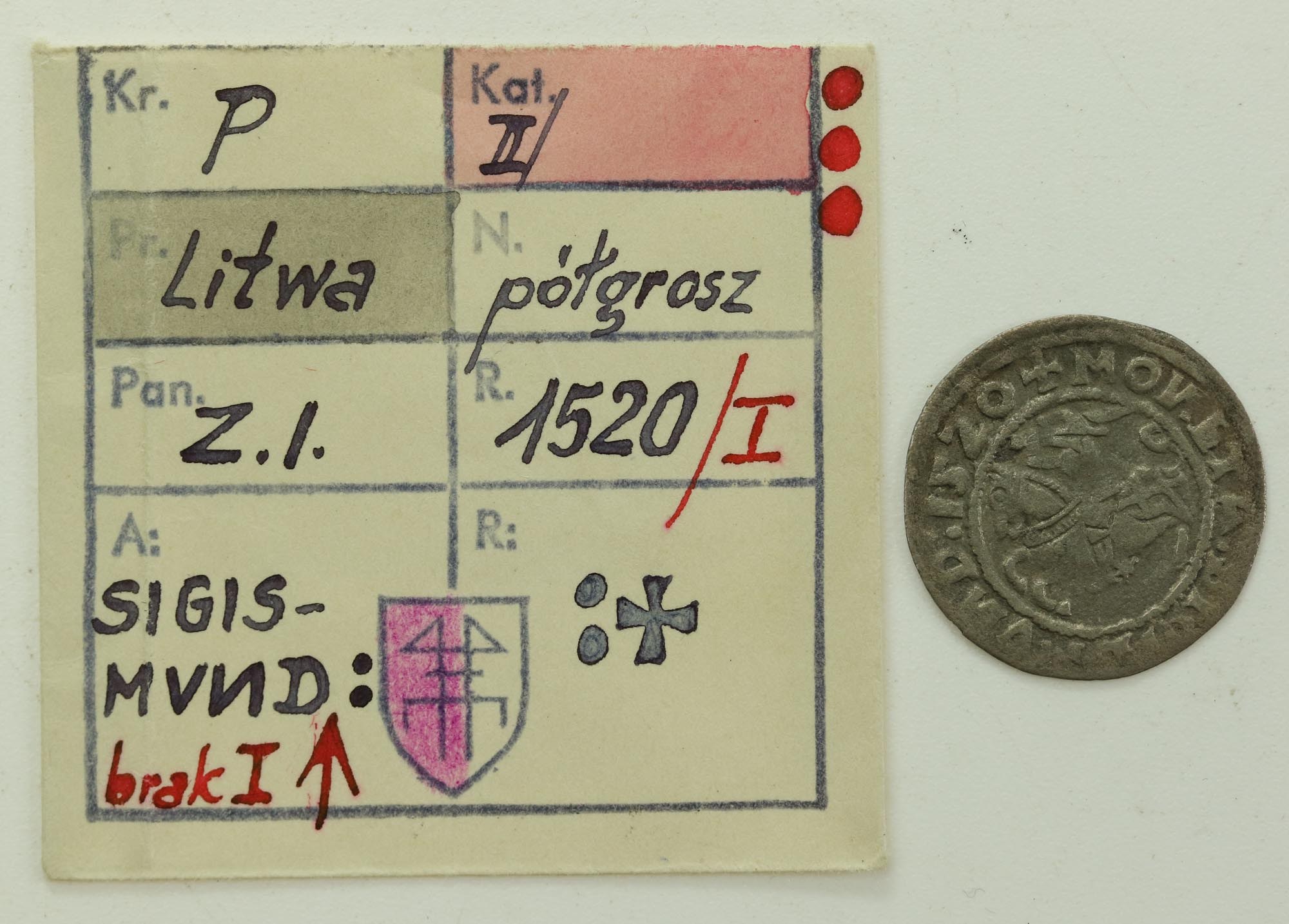 Zygmunt I Stary, Półgrosz 1520, Wilno - SIGISMVND, rzadki - ex. Kałkowski. Rzadka odmiana ze skróconym imieniem władcy: SIGISMVND zamiast SIGISMVNDI. Litery N w odbiciu lustrzanym. Ładny obiegowy egzemplarz. Stan: 3. Dołączona koperta ze zbioru wraz z własnoręcznym opisem Tadeusza Kałkowskiego, autora książki ,,Tysiąc lat monety polskiej". Wyśmienita proweniencja. Literatura: Ivanauskas 1S216-9 (RR), Kopicki 3158