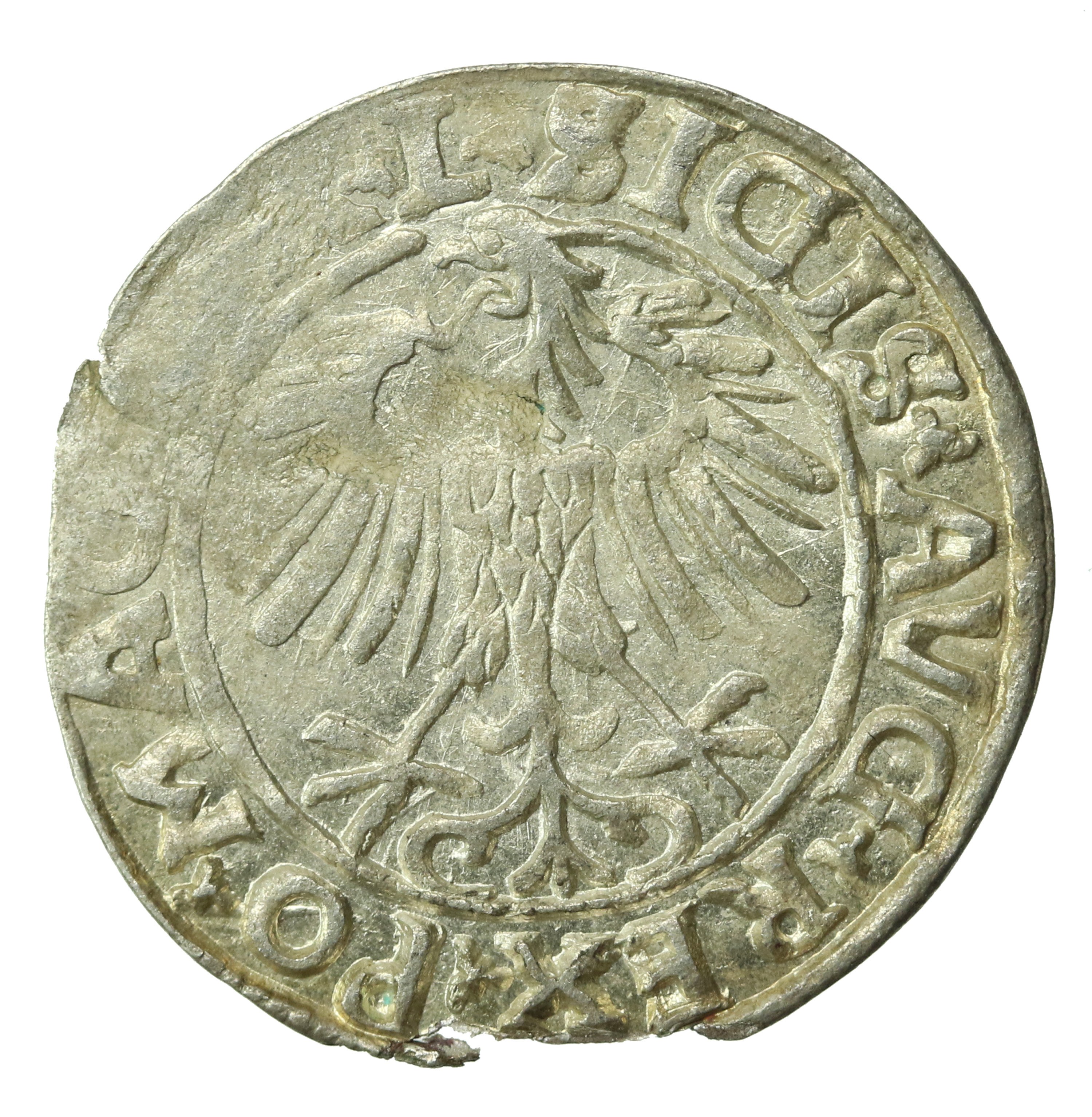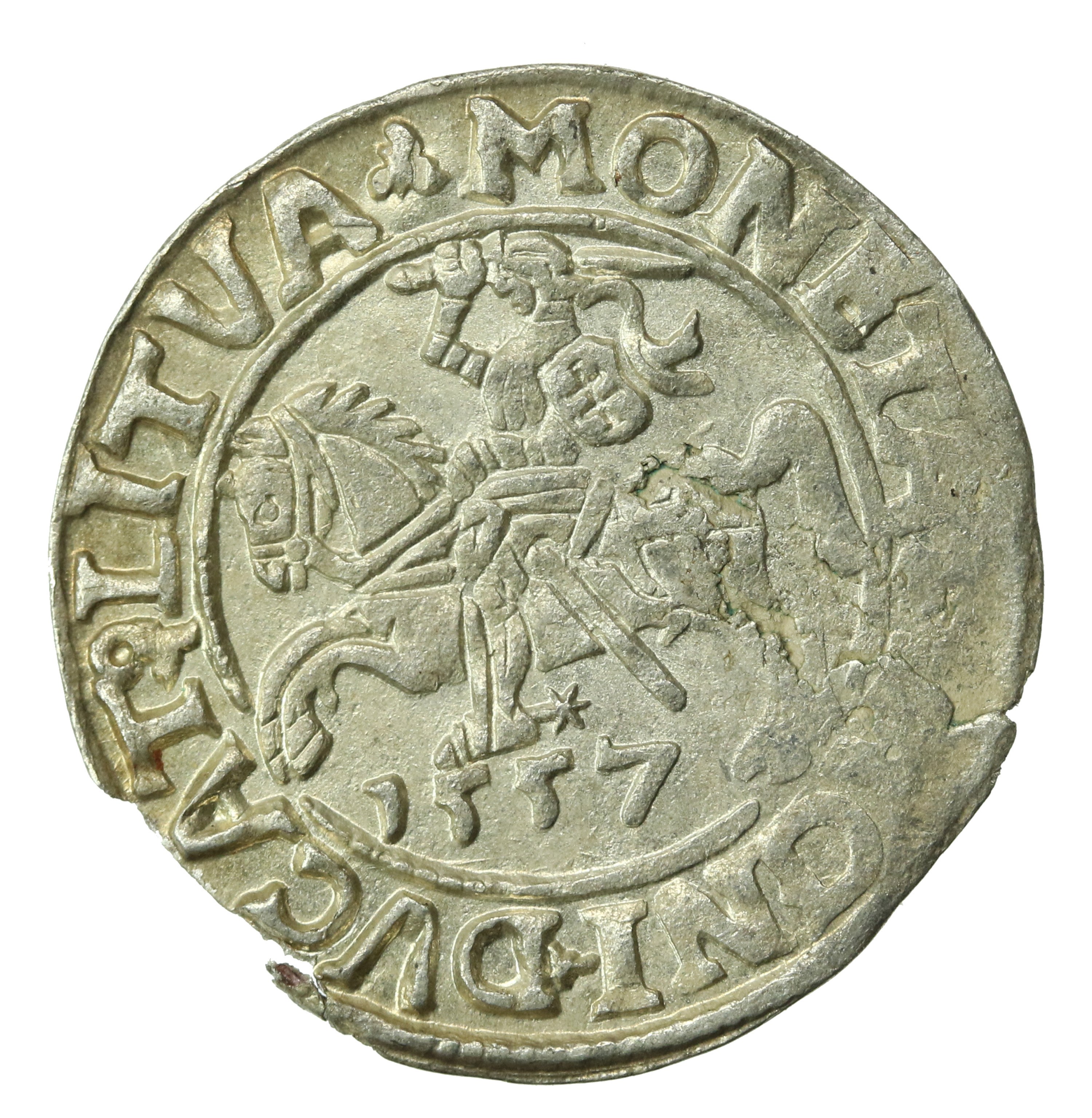 Zygmunt II August, Półgrosz 1557, Wilno, L/LITVA. Stan zachowania ~2. Uszkodzony krążek ale dobrze zachowana moneta z połyskiem menniczym. Literatura: Kopicki 3249