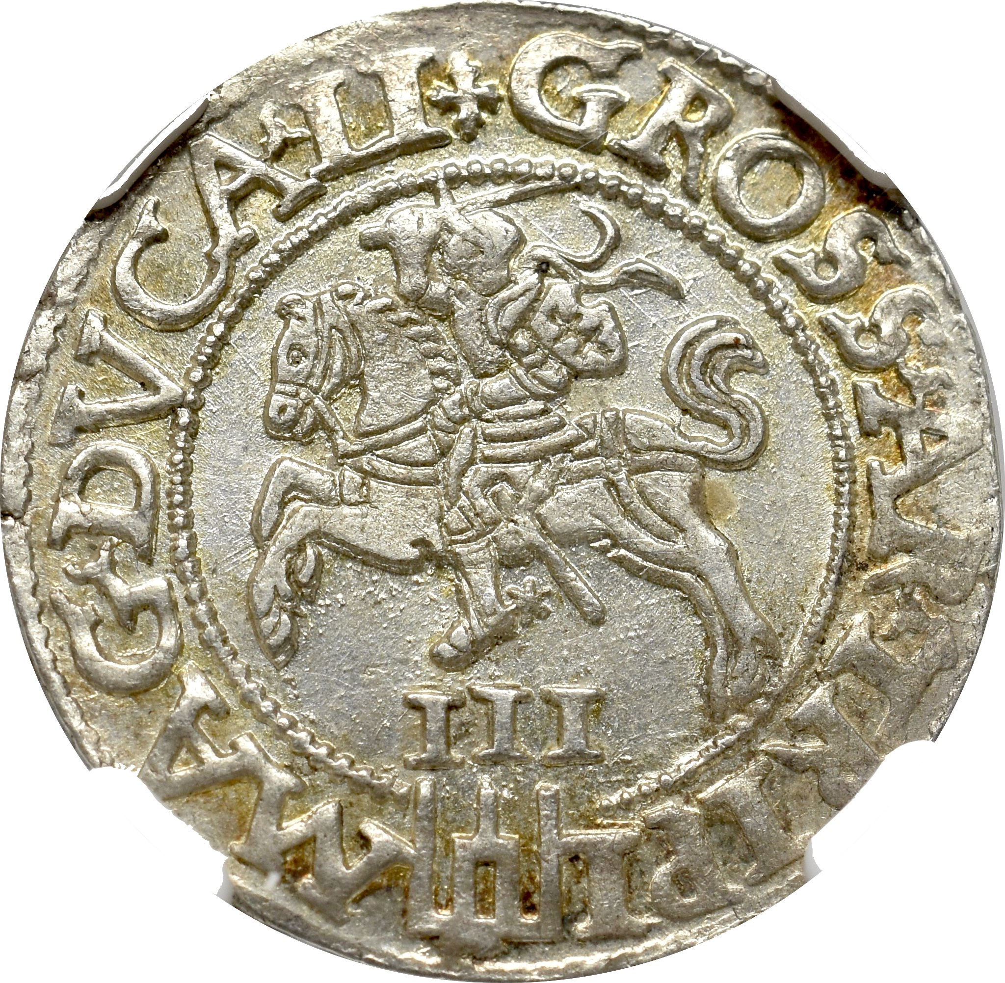 Rzadka odmiana z TRIPL w legendzie rewersu i końcówkami legend LI/LI, wybita na szerokim cięższym krążku - średnica 22,7mm.