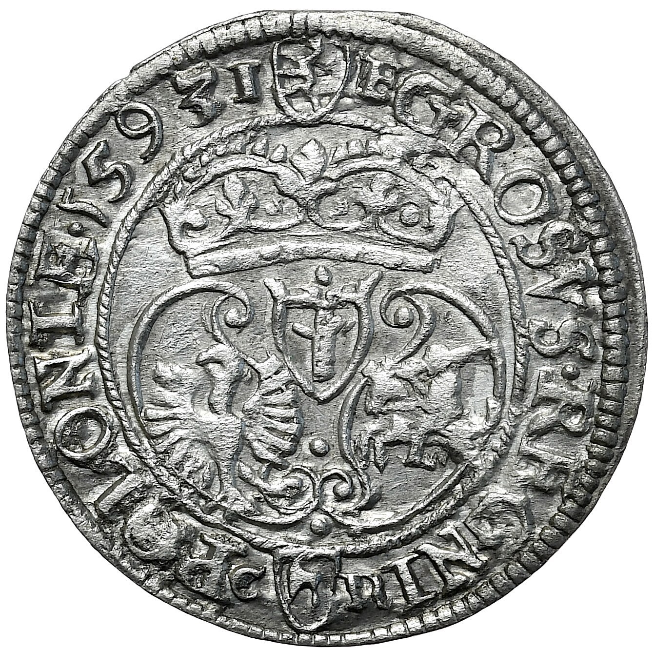 Bardzo rzadki grosz z mennicy olkuskiej. Słoneczko po prawej, Dzban po lewej, data rozdzielona.