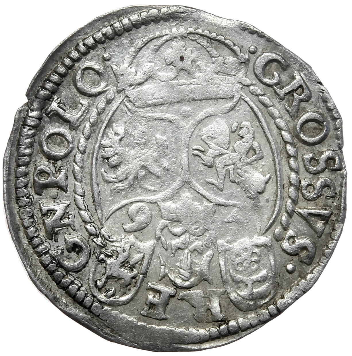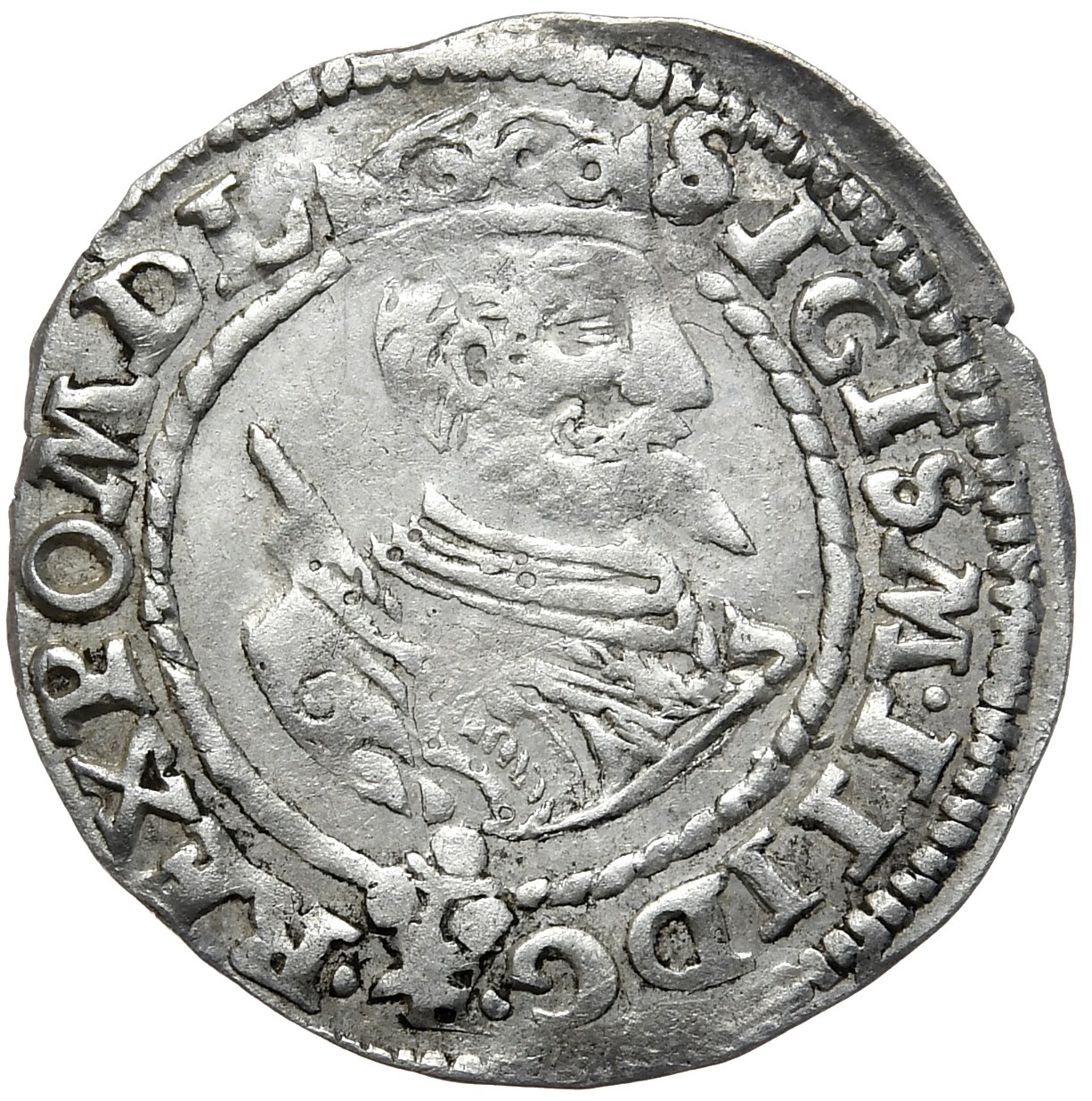 Emisja z mniejszym popiersiem, pod którym umieszczono kwiatek, oraz dwiema tarczami herbowymi (z Lewartem i Różą) dzielącymi legendę rewersu.