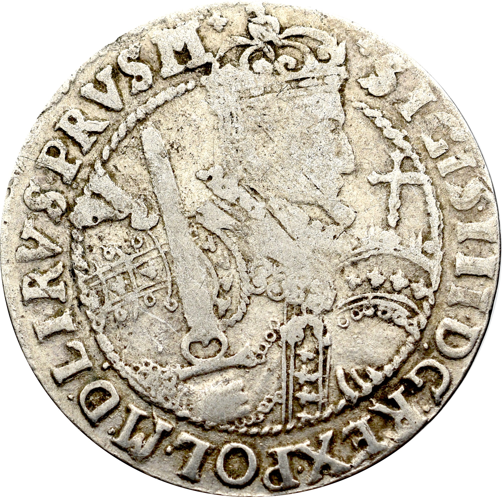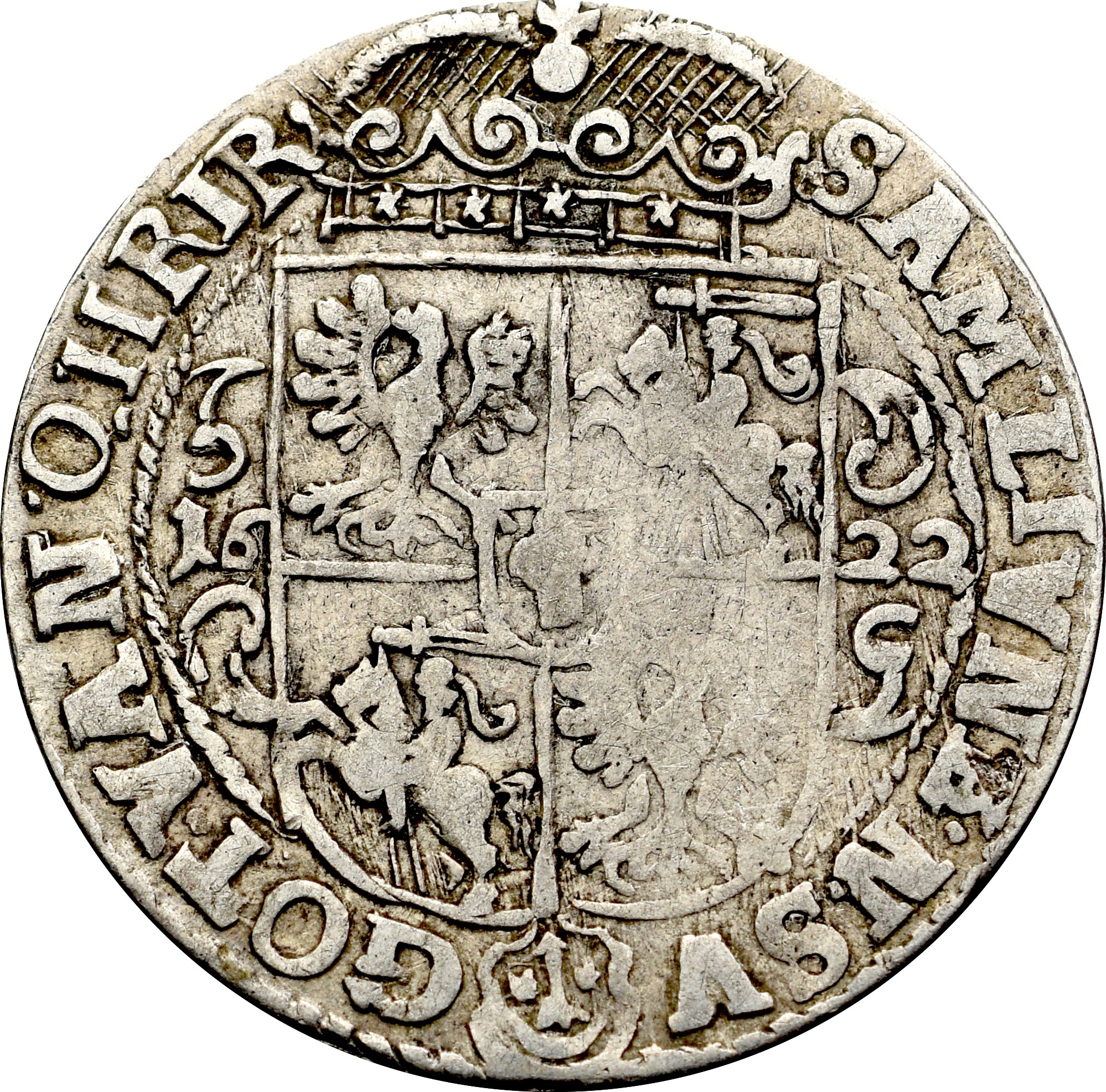 Odmiana z końcówką legendy awersu PRVS M w wariancie z rewersem z charakterystyczną koroną w gwiazdkami w obręczy.