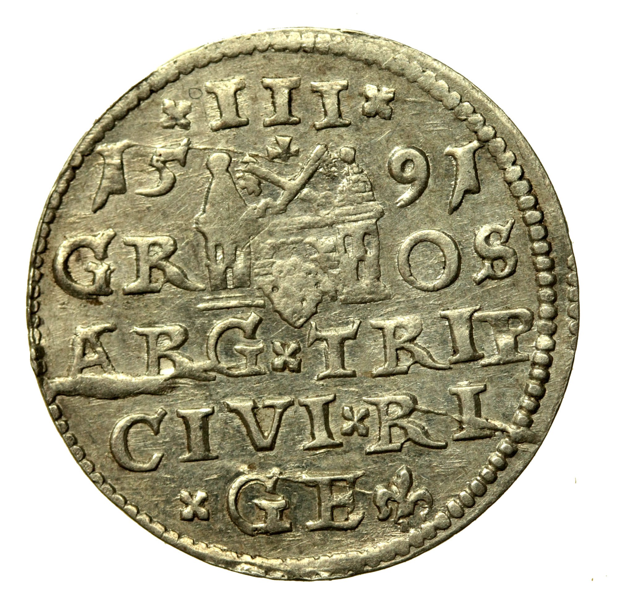 Zygmunt III Waza, Trojak 1591, Ryga – LIV – rzadsza. Rzadka odmiana legendowa, z tytulaturą zakończoną PO*D*LIV. Stan zachowania 2. Mocny blask na całej powierzchni. Literatura: Kopicki 8186