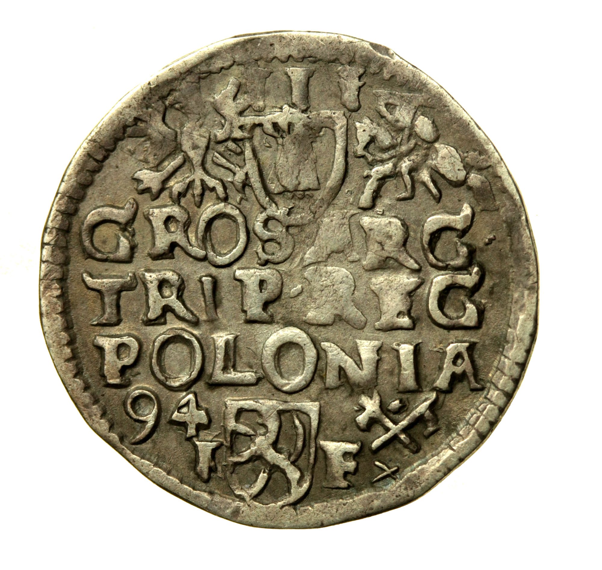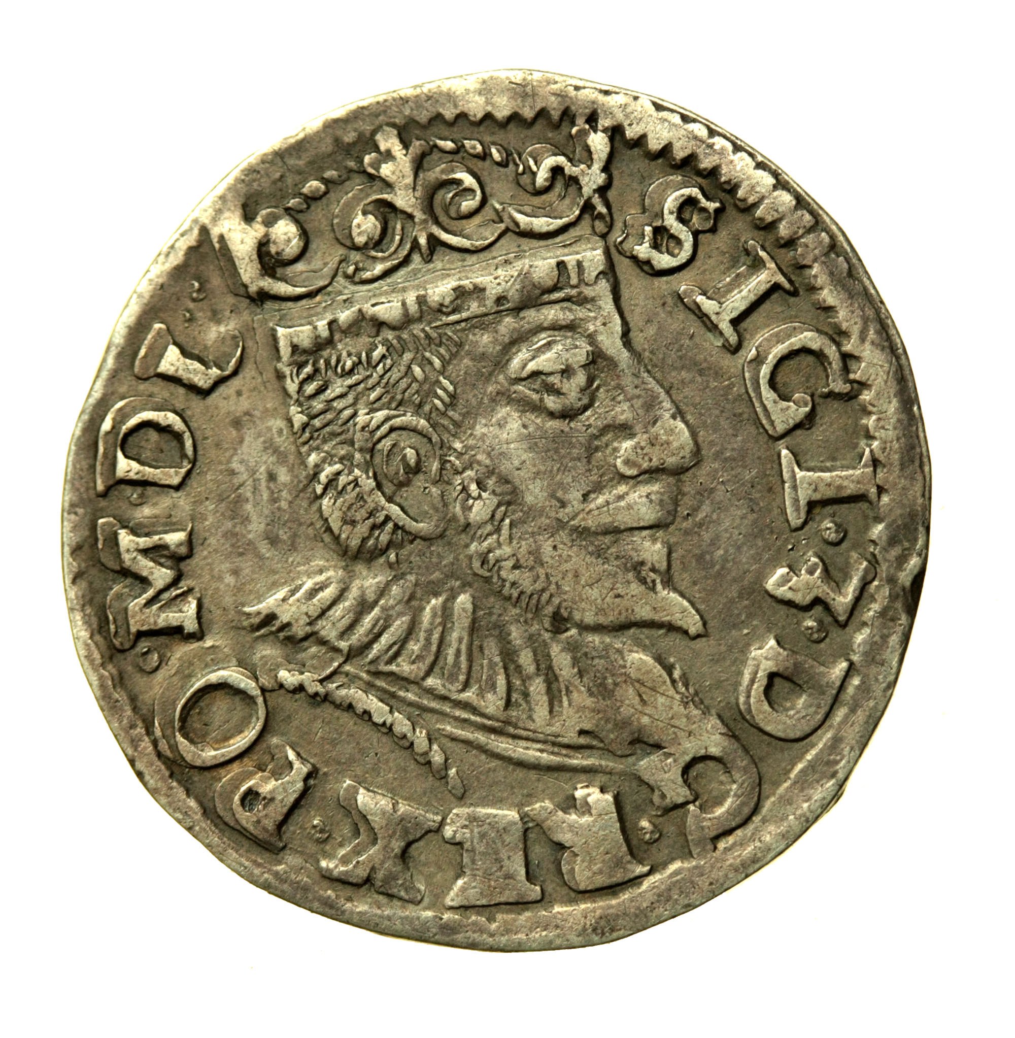 Zygmunt III Waza, Trojak Poznań 1594. Ładna moneta ze starą patyną. Wydłużona twarz króla, korona z lilią bez obwódki, końcówka legendy awersu L, na rewersie POLONIA. Stan zachowania 3+/2-. Dobre detale i złotawa patyna. Literatura: Kopicki 979