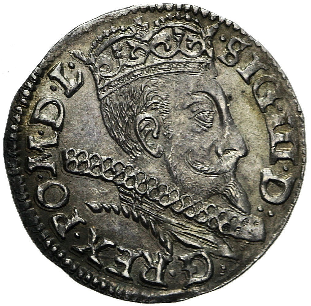 Rzadziej spotykany trojak z napisem na rewersie w dwóch wierszach. Bardzo ładnie zachowany egzemplarz. Świetnie wybity i zachowany portret króla. Egzemplarz ze starą patyną. Polecamy.