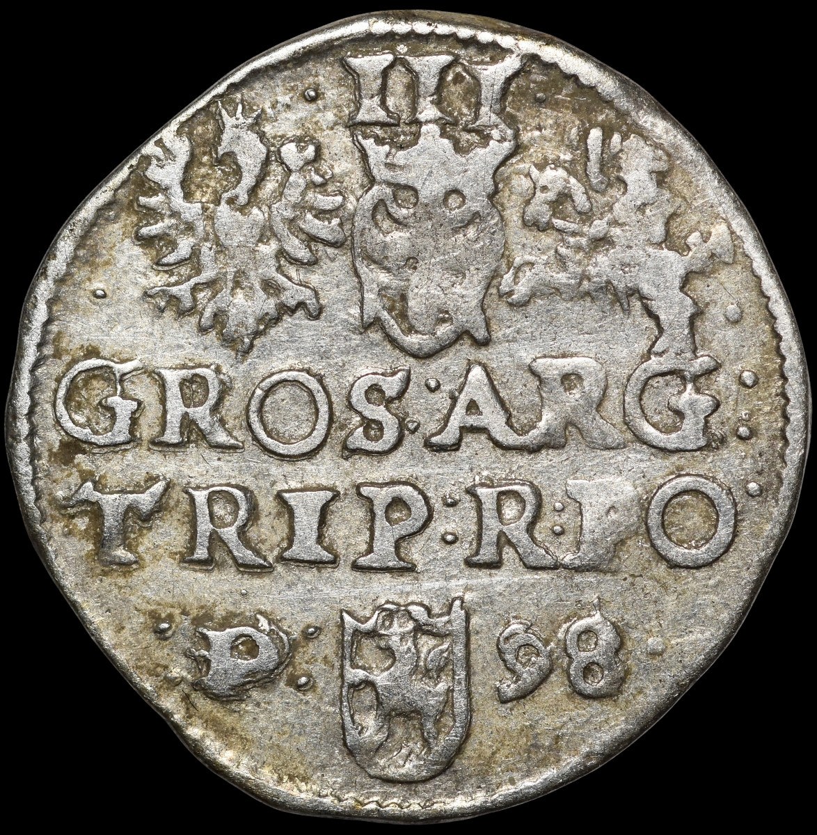 literą P (oznaczeniem mennicy poznańskiej) z lewej i skróconą datą 98 z prawej