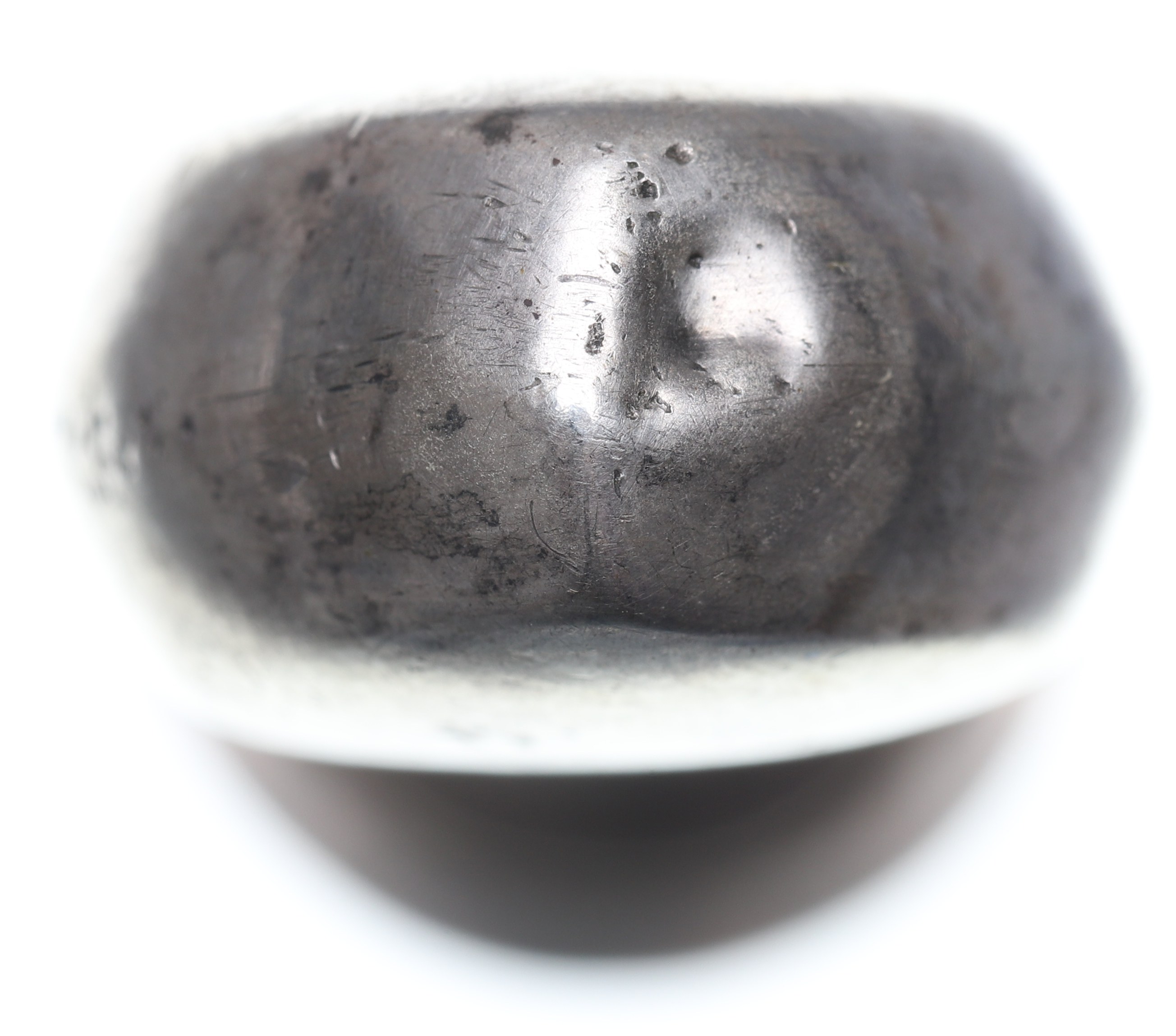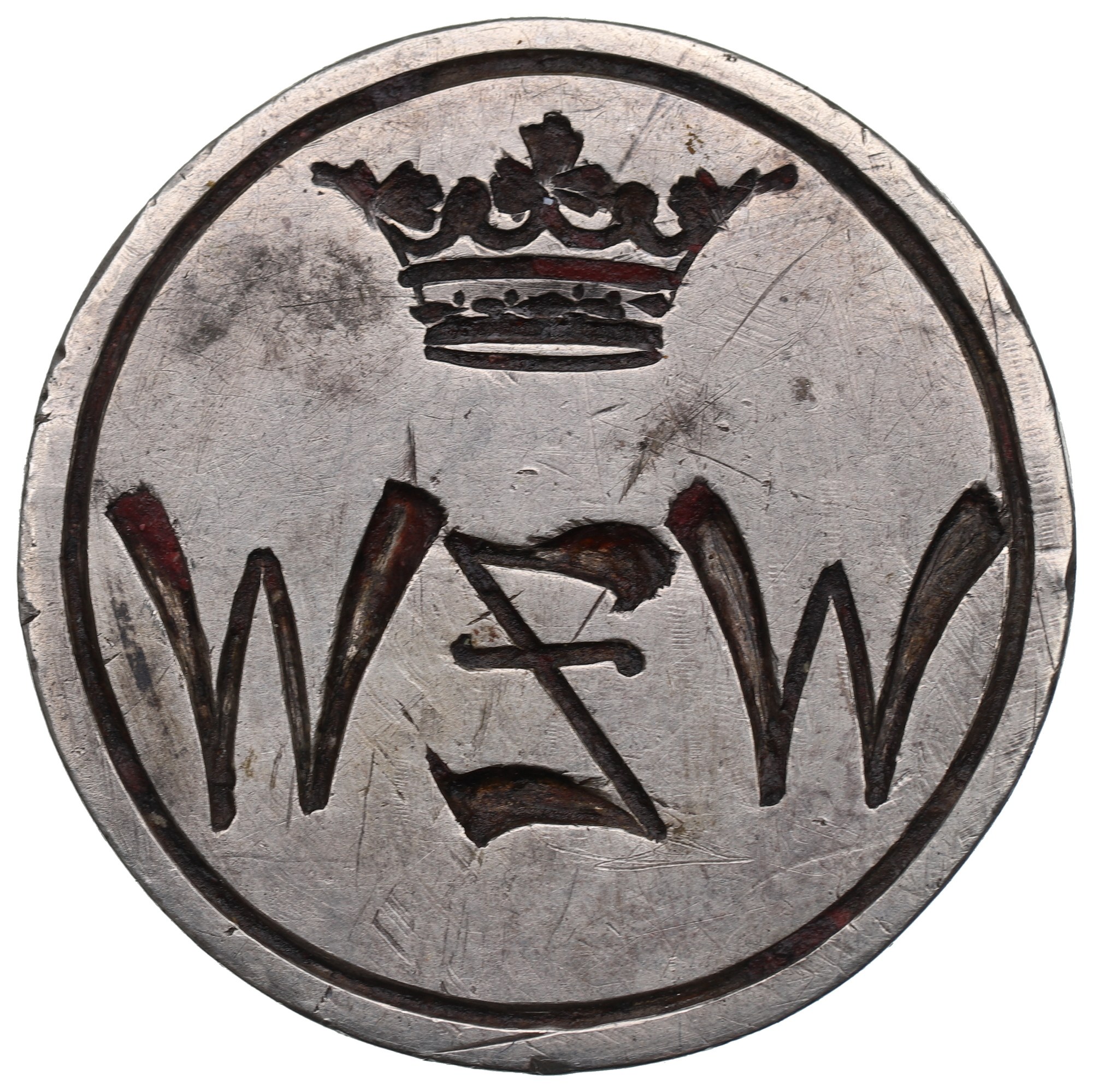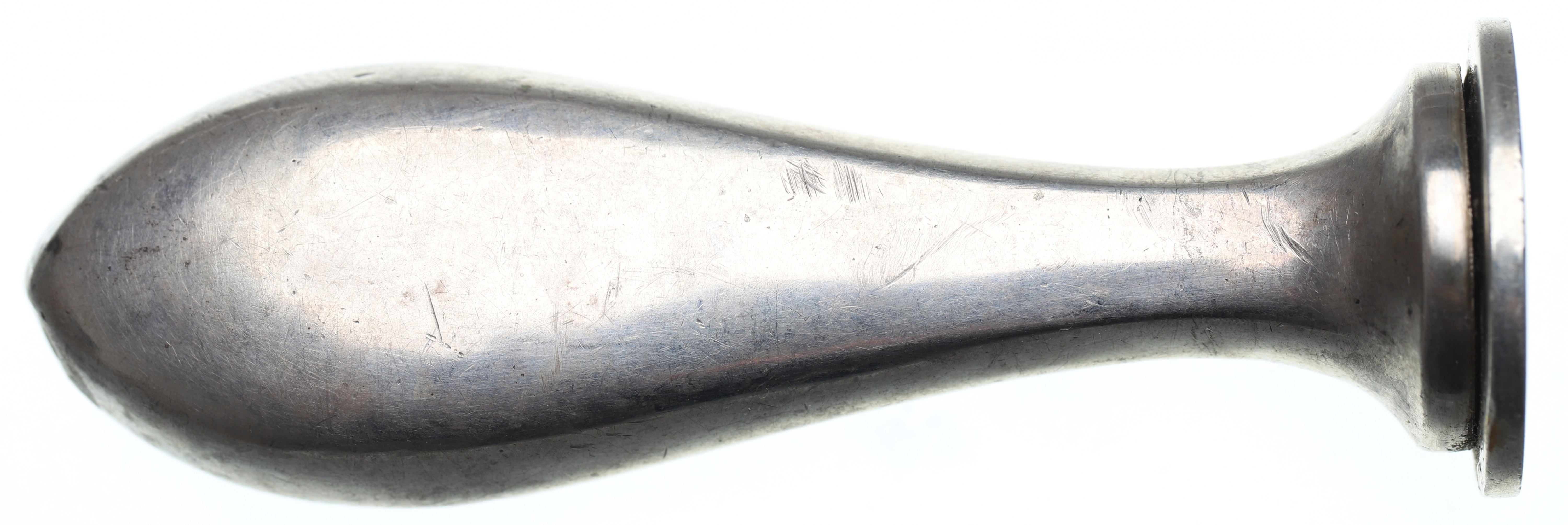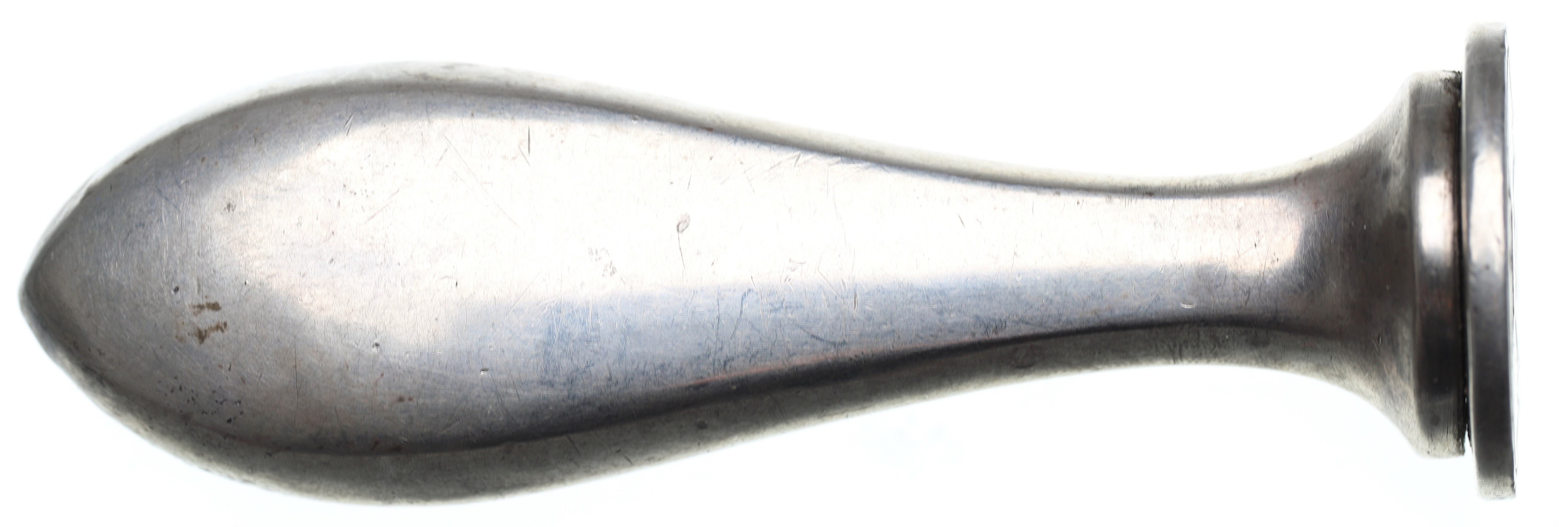 Srebro .800, średnica powierzchni pieczętnej 24 mm, wysokość 7,5 cm, waga 43,39 g.