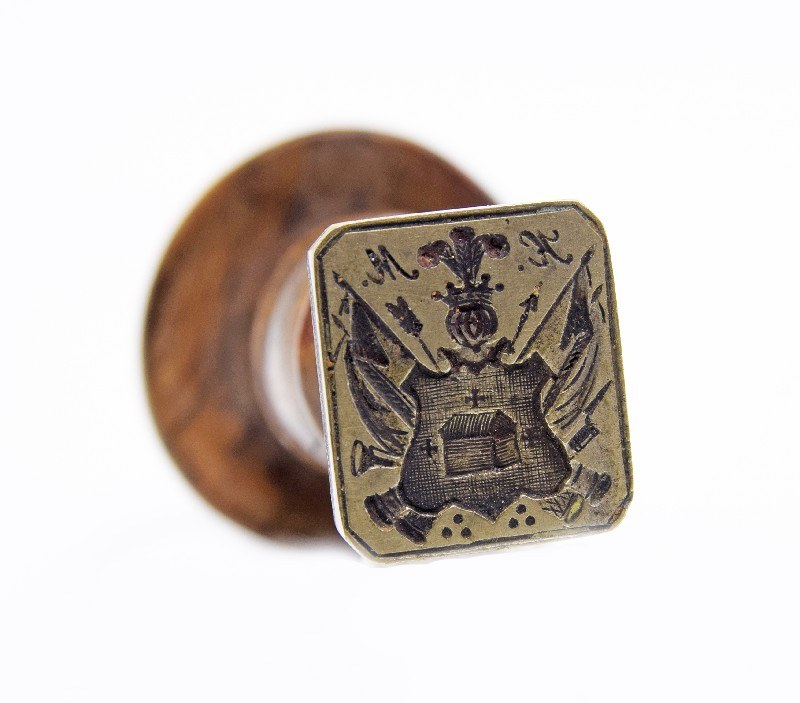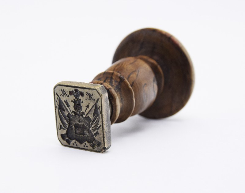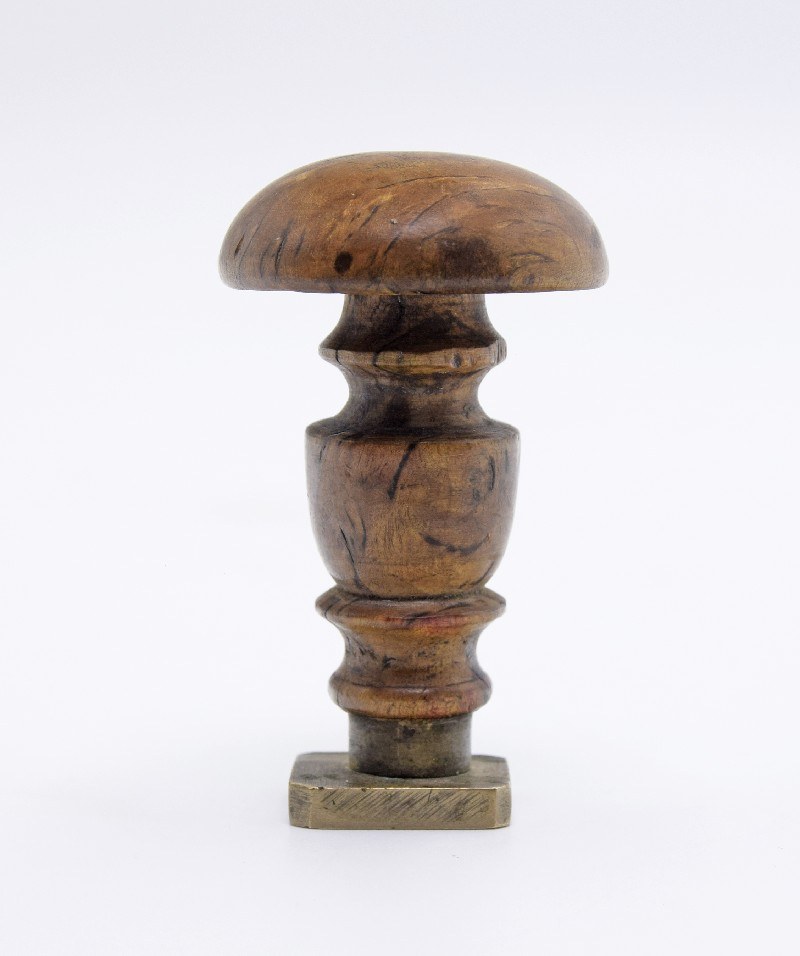 mosiądz, drewno; wys. 6 cm; pole pieczętne: 2 x 1,8 cm.